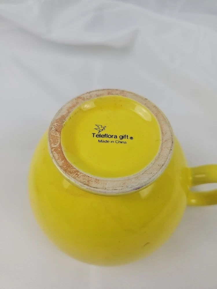 This Yellow Smiley Face Teleflora Coffee Mug is a 20 oz oversized planter or pen holder. Made of ceramic in a contemporary style, it features a round shape with a glossy finish. The mug has a 4.25" opening and measures 4" in height, with a yellow color and a happy theme. This unisex item is suitable for hot beverages and has a printed backstamp. It is a fun and cheerful addition to any home or office.