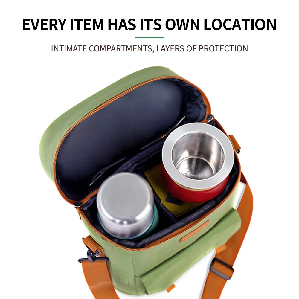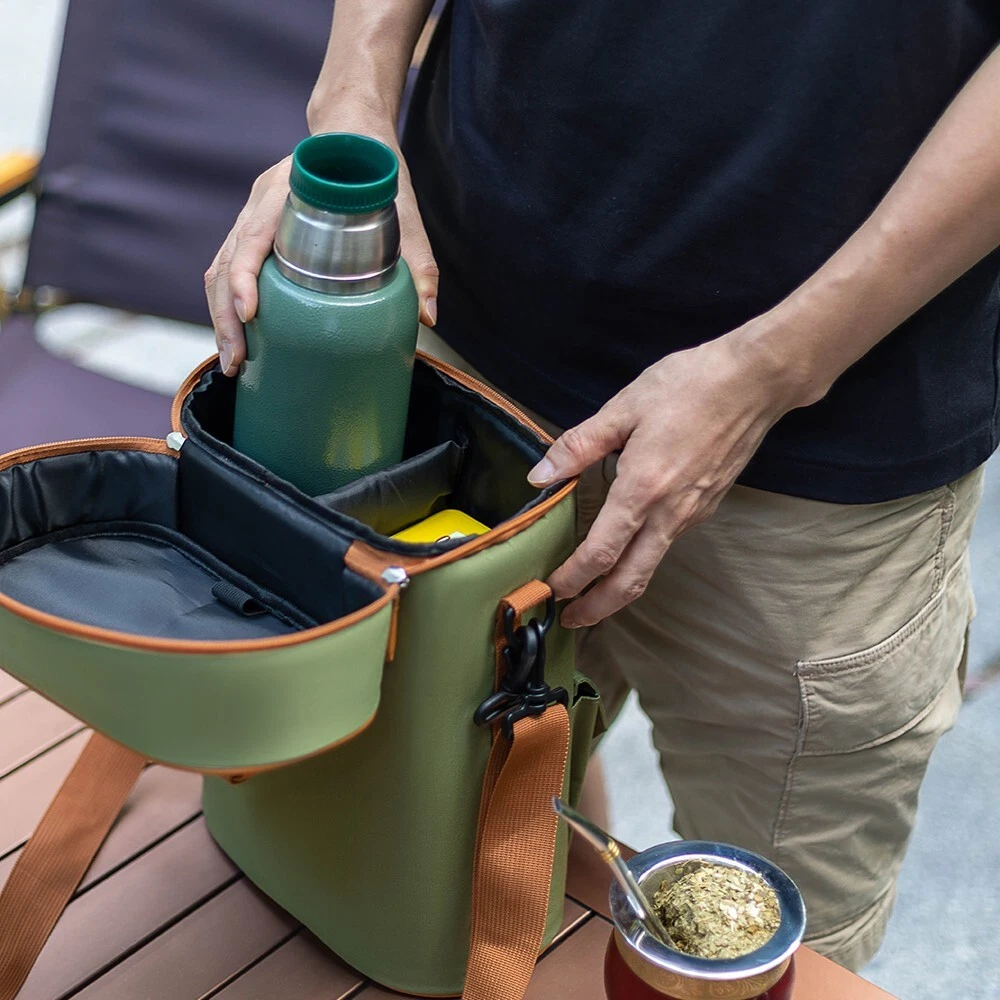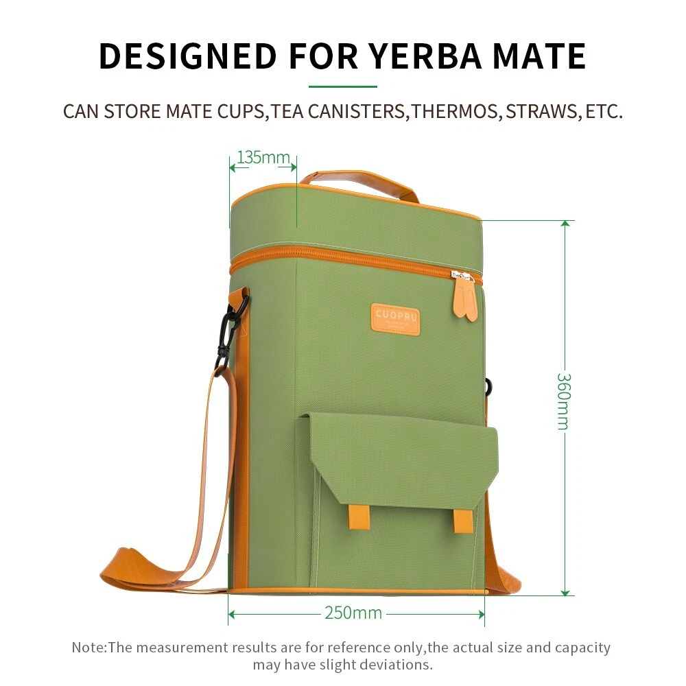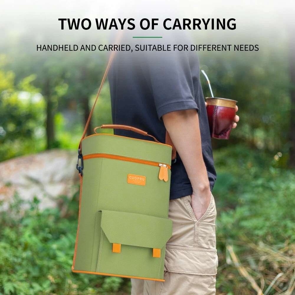Carry your CUOPRU Premium Yerba Mate Kit in style with this versatile Army Green tote bag, perfect for any outdoor adventure. Crafted from durable polyester and canvas, this bag is designed to withstand the rigors of travel, whether you're headed to the beach, hiking trails, or picnicking in the park. Its single chamber ensures your items stay secure and organized, while the adjustable shoulder strap and insulated features keep your drink at the desired temperature. Measuring 15 x 9.8x 4.8 inch (L x W x H) , this tote is compact enough for easy portability yet spacious enough to hold all your essentials. The sturdy handle allows for convenient carrying, and the bag's sleek design fits seamlessly into any setting. Whether it's for personal use or as a thoughtful gift, this CUOPRU tote is a practical choice for every occasion. Packing include: 1*Mate Bag Double layer waterproof yerba mate tote carrier or 2 bottle wine travel bag by CUOPRU features with high-quality fabric to ensure maximum durability and sturdy structure. Thick padded lining with waterproof material to help store your wine from light and avoid water caused by external weather or condition. Internal collapsibale and padded divider to protect wine bottles from collision during transportation. Also this portable design 2 bottle wine travel bag of CUOPRU has an adjustable and detachable shoulder strap along with padded hand straps for different ways of carrying. This double layer waterproof yerba mate kit bag has a dedicated yerba mate straw position, and there are two compartments inside separated by adjustable Velcro. You can place the yerba mate set which included mate insulated bottle pot (Max 1.2ML Size: 4.5L x 5.5W x 14.6H), yerba mate tea storage box, yerba mate cup (gourd). Outdoor Mate Bags: Companion bags for outdoor travel, and great for transporting yerba mate set or wine set to parties, wine dinners, restaurants, pool or beach parties, picnics, concerts and sporting events. Ideal Yerba Mate& Wine Lover Gift. Elegant look and pratical design make this yerba mate or wine gift carrier suitable for all age about the lovers. If your families or friends are yerba mate or wine drinkers and love to share yerba mate or wine with others, this gift carrier bag would be a excellent gift for them.