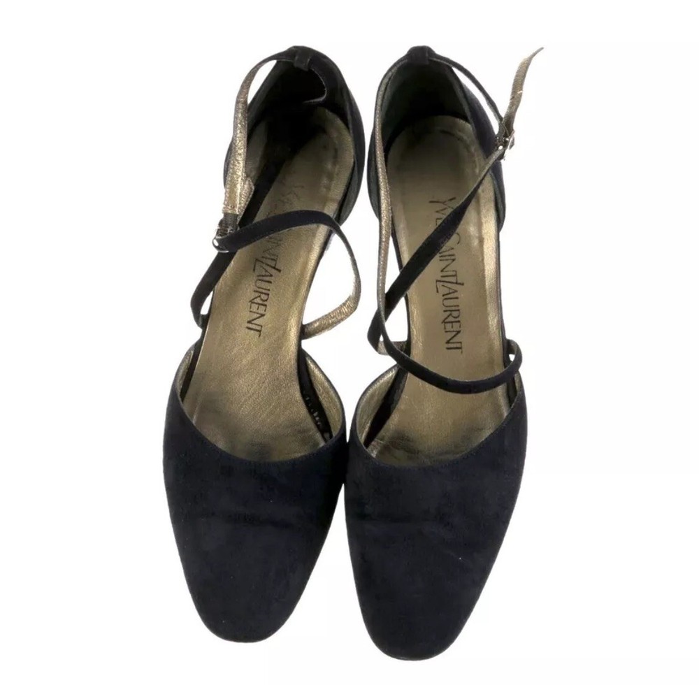 These Yves Saint Laurent vintage suede pumps are a stylish choice for women in size 6.5. The blue color and suede material give them a luxurious and elegant look, perfect for formal occasions or adding a pop of color to any outfit. The pump style and brand reputation of Saint Laurent ensure a high-quality and fashionable addition to any woman's shoe collection. Pre owned Description • Yves Saint Laurent Vintage Pumps • Blue Suede • Semi-Pointed Toes • Crossover Straps & Buckle Closure at Ankles Designer Fit: Pumps by Yves Saint Laurent typically run a half size small. Estimated item measurements Heels: 1.75" Gender: Women Details: Heavy discoloration at insoles; moderate creasing at vamps; moderate residue at insoles; wear at soles