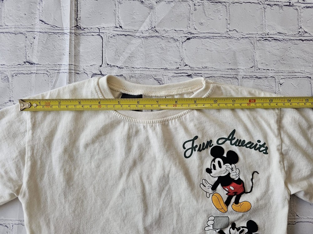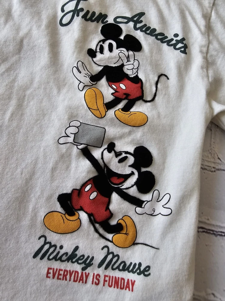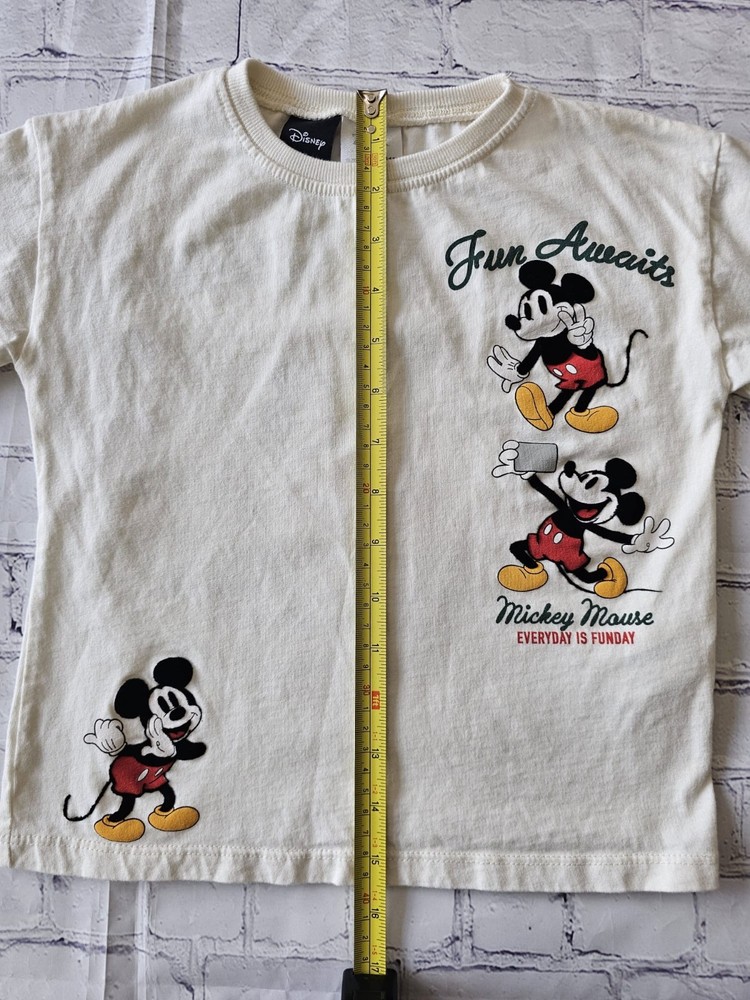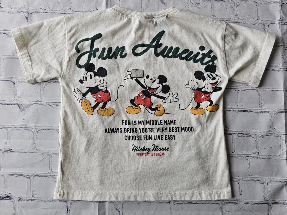 Description: Bring some Disney magic to your child’s wardrobe with this adorable ZARA Kids Mickey Mouse short-sleeve T-shirt. Featuring a cheerful "Fun Awaits" and "Everyday is Funday" graphic print of Mickey Mouse in vibrant red, yellow, and black tones. Brand: ZARA Kids (Disney Collection) Size: 5 Years / 110 cm Material: Main fabric: 100% Cotton Secondary fabric: 98% Cotton, 2% Elastane Color: Off-white / Cream Made in: Morocco Condition: Pre-owned, gently used, in good condition. No holes or major stains. Minor signs of wear consistent with normal use. Care Instructions: Machine wash cold, tumble dry low, do not bleach (see care tag for details). Perfect for everyday wear, playtime, or Disney fans of all ages. Your little one will love the comfortable fit and fun design!