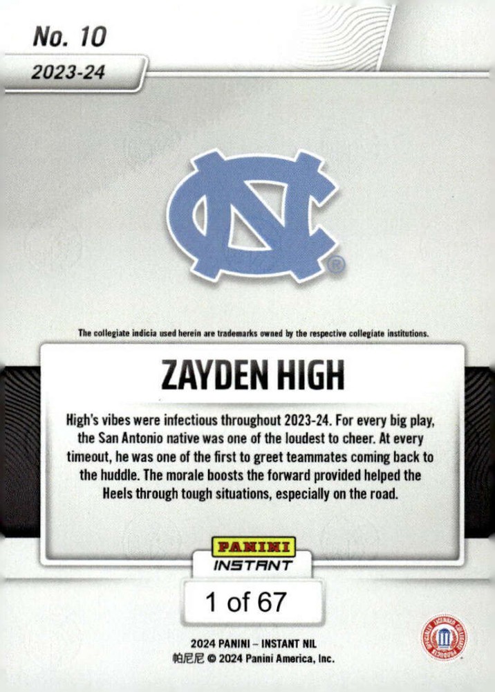 ZAYDEN HIGH 2024 ZAYDEN HIGH RC 2024 Panini Instant NIL Pre-ROOKIE #10 UNC PR:67 NM-MT NCAA Basketball NORTH CAROLINA TAR HEELS COMBINED SHIPPING AVAILABLE IF NOT ALREADY PAID FOR. PLEASE REQUEST IF NOT AUTOMATICALLY CALCULATED IN YOUR CART. All imperfection lines are from the scanner unless otherwise noted in the title and description. Request photos if concerned. Shipped to U.S. locations via USPS First Class Stamped Mail with eBay Tracking and up to $20 Insurance . Other delivery options available. COMBINED SHIPPING AVAILABLE IF NOT ALREADY PAID FOR. PLEASE REQUEST. Partial refunds for shipping and not available after payment is made. International orders are mailed via International Stamped Letter Mail and do not include tracking. If tracking is desired, please select during checkout. International Customers: Note that standard post is taking 2-5 weeks for delivery to many locations worldwide due to current conditions. Please be patient for receipt of order, or request to upgrade to trackable delivery for faster and more secure delivery. To do so, purchase, but DO NOT PAY upfront. Send a message requesting a trackable delivery quote and I will provide an invoice with this option. If prepaid, I cannot refund or modify delivery method. Thank y o u . This listing created with GLETech Multiple Selling Channel tools.