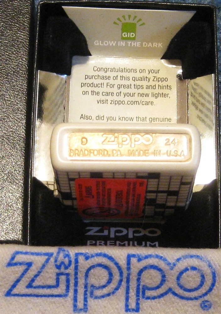 ~ZIPPO LIGHTER~ 540 GLOW IN DARK DESIGN in Premium Display Box ZIPPO is MINT, never been Filled & Fired 2024 ~ 540 Matte Glow in Dark Green CROSSWORD PUZZLE DESIGN ~ BLACK & WHITE GAME ~ 540 COLOR ~ ALL 5 SIDES ~ 46285 ~ NEW AND EXCITING Orange Safety Sticker is On All Authentic ZIPPO'S have: The WORLD FAMOUS ZIPPO GUARANTEE Any Zippo lighter, when returned to our factory, will be put in first-class mechanical condition free of charge, for we have yet to charge a cent for the repair of a Zippo lighter, regardless of age or condition. The finish, however, is not guaranteed. GREAT Lighter to add to your ZIPPO Collection! AUCTION POLICY PLEASE READ PRIOR TO BIDDING. ALL ITEMS SOLD AS IS! **Email questions before you bid** BY BIDDING you agree that you are ENTERING INTO A LEGAL AND BINDING CONTRACT to PURCHASE THIS ITEM. Buyer to contact seller within 3 days of auction end. Payment to be made within 10 days of auction end. IF YOU PAY WITH CREDIT CARD USING PAYPAL All CREDIT CARD PAYPAL Shipments must be made to CONFIRMED ADDRESSES ONLY. If you do not have a Confirmed PayPal Address, you must email me before bidding. SHIPPING INFORMATION UNITED STATES CUSTOMERS Email for shipping rates if you are not within the lower 48 USA States. INSURANCE is Included with purchase over $100.00. DISCOUNT SHIPPING is available on multiple auctions won just let me know you are bidding on another auction. INTERNATIONAL CUSTOMERS * Due To eBay Changes * All INTERNATIONAL SHIPMENTS will now be Through the EBAY GLOBAL SHIPPING PROGRAM. NO SHIPPING TO THE FOLLOWING ITALY REFUND POLICY NO REFUNDS for BUYERS REGRET, PLEASE ASK YOUR QUESTIONS PRIOR TO BIDDING. NO REFUNDS unless I have Misrepresented the item. I do my best to make sure the item is identified correctly, but mistakes do happen from time to time, as none of us are perfect. If you feel the item has been misrepresented, notify me within 48 hours of receiving item. You must obtain a RETURN AUTHORIZATION. DO NOT SHIP AN ITEM BACK without an authorization. With an authorization I will issue a refund Less Shipping, ONLY after I have received the Misrepresented item.