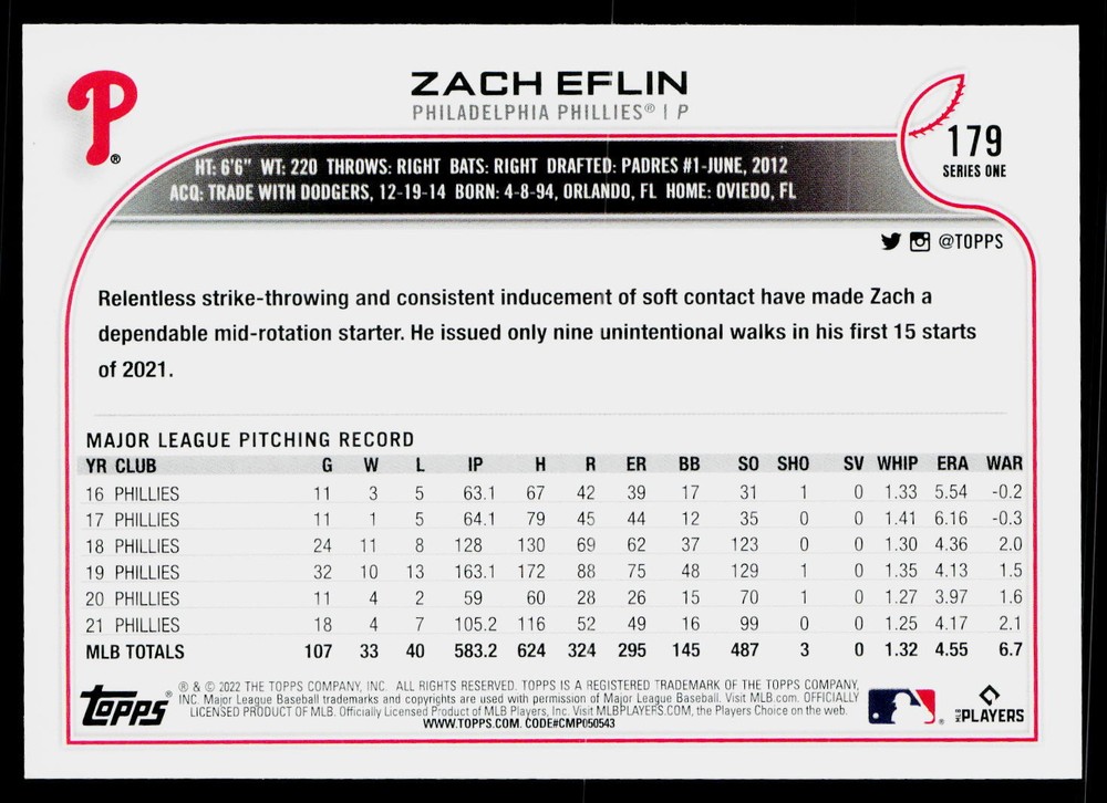 You will receive a , Zach Eflin 2022 Topps #179 Philadelphia Phillies Near Mint or Better condition. Please note i am not a professional card grader the condition of raw cards can be very subjective. Please refer to the high quality pictures to determine condition yourself any questions at all please feel free to ask!! we take pride in the quality of cards we sell and ship, all cards will be shipped in a penny sleeve and top loader for added protection. be sure to save us as a seller, as we are growing and listing daily THANK YOU FOR YOUR BUSINESS