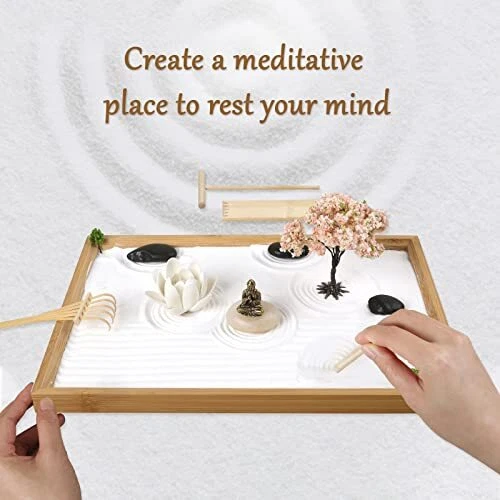 Return Policy Fast Delivery Trusted seller Zen Garden Kit for Office Desk, Japanese Meditation Decor Sand Art with Tray/Buddha Statue/Handmade Ceramic Lotus Incense Holder/Zen Accessories, Spiritual Gift for Women Men Yoga Mind Relaxation Product Description Less Is More - With the purpose of “move the viewer from a cluttered mind to a state of focused mind”, our zen garden kit is designed with the vital elements of large-scale zen gardens. The miniature dry garden comes with a 13x8.6” bamboo tray, buddha statue, lotus incense holder, sand, rocks, cherry tree, mini plants and 4 miniature zen tools. Create your own meditative place to rest the mind! Smooth Mind, Bring Calm - Combing and arranging a zen garden is a very calming and relaxing activity! Japanese zen gardens create a sense of peace, harmony and tranquility. Often taking a moment to meditate is impractical in an office setting, but this mini desktop zen garden makes it happen. Definitely help bring harmony between our busy daily lives and nature! Valuable Zen Accessories - Compared with other resin statue, our Buddha statue is made of pure copper, lightweight, corrosion-resistant and long-lasting. Handmade ceramic lotus works with as an incense holder, fragrance diffuser (just spray perfume on it) and tabletop decor. 4 different zen tools allows you to design freely. Add Peaceful Aura To Your Decor - Japanese gardens are havens of beauty, tranquility and cultural landscapes, and places for natural healing. It is great for office workspace, offering you a relaxing break from computer work. Also a meditative decor for living room, bedroom, study room or guest room. Ideal Spiritual Gift - Looking for a special, mindful gift? Try our Japanese zen garden, allowing to connect with nature and cultural art. A fascinating gift to help combat stress and anxiety during hectic moments. Nice companion for work, yoga, fitness and relaxation. Shipping Returns Payment Shipping Shipping is FREE to all addresses other than APO/PO boxes in the lower 48 states. All our stock ships from US-based warehouses. Shipped via USPS or UPS (depending on location and package weight) Unless stated otherwise, all orders will ship within 24-72 hours of your payment being processed. Check our feedback to see the great reviews of FAST shipping we offer. Returns Seller does not accept returns Payment We currently accept payment via eBay managed payments only. Once payment is cleared, we will dispatch your shipment within 1-3 business days. Please refer to the "Shipping" tab for more information regarding shipping speed to your destination.