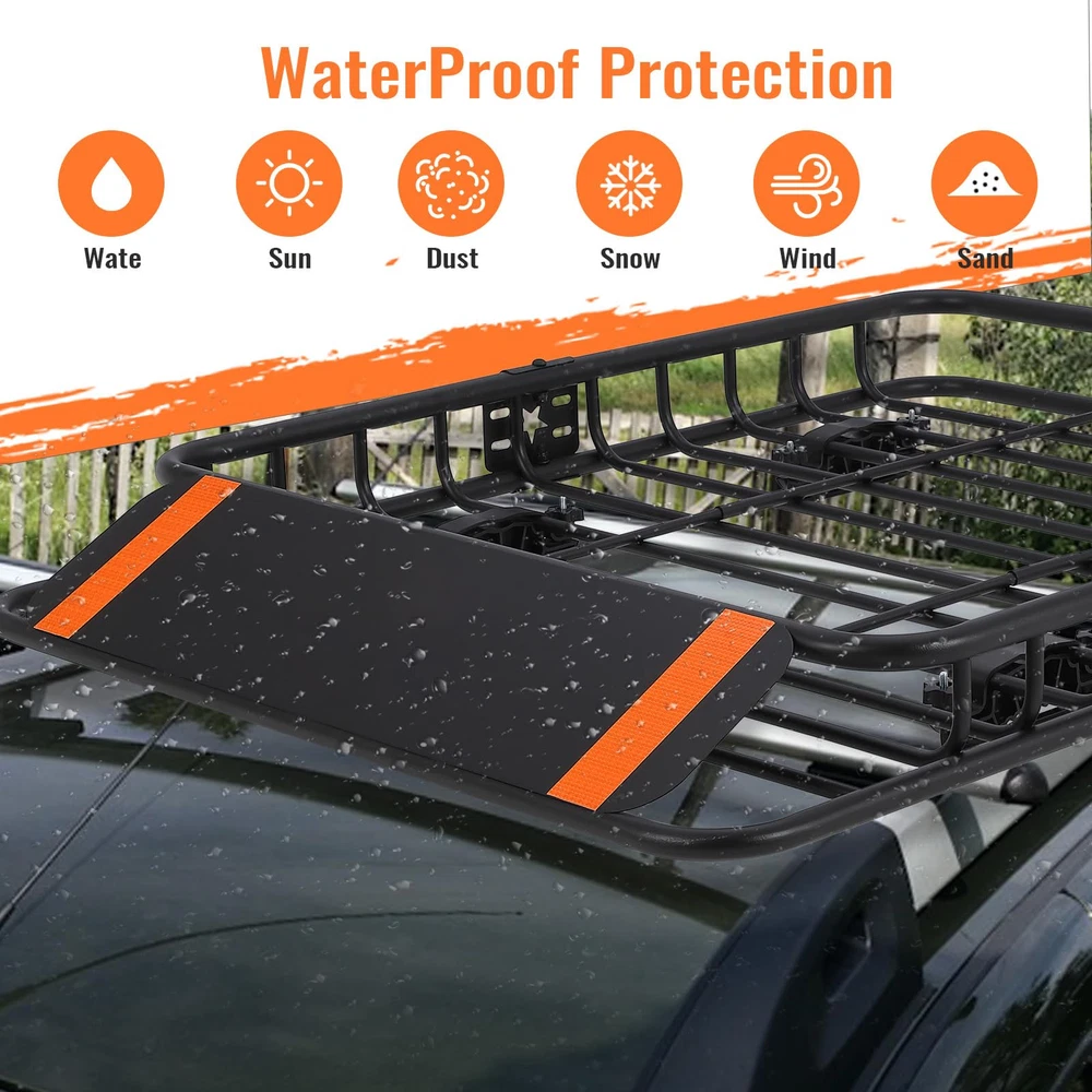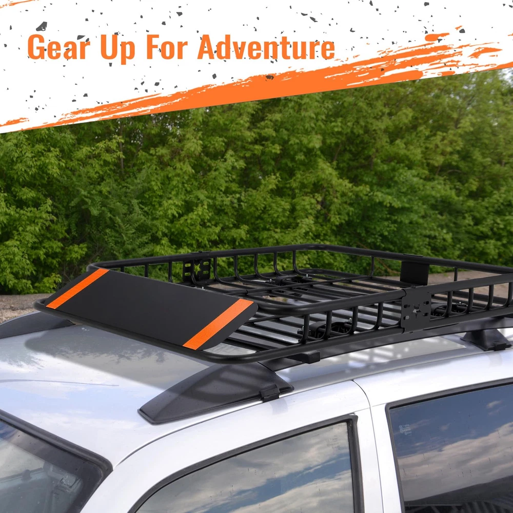 【Versatile Design】- Featuring 5" high metal side rails to keep your items secure while on the road, this roof rack basket is perfect for storing extra luggage, camping gear, cargo bags, and more. Ideal for those living the outdoor adventurer lifestyle. 【Dimension and Load Capacity】- Measuring at 51" x 36" x 5", this universal roof rack cargo basket boasts a 200 lb capacity and extendable design. Easily attachable to vehicles with cross bars, from cars to trucks and SUVs. 【Easy Installation】- Effortlessly attach this hitch cargo carrier to most roof racks for quick and secure mounting. Complete with a car roof rack wind deflector for a peaceful travel experience. Maximize your roof rack storage with convenience. 【Solid Construction】- Engineered to withstand heavy loads, our roof basket is constructed from high-quality materials for durable performance on your roof and cargo racks. Enhance your roof rack storage with our range of accessories to customize and optimize your setup. 【Rust & Corrosion-Resistant Construction】- Crafted from durable powder-coated steel, this roof rack offers long-lasting corrosion resistance. To maintain its condition, it is advisable to park your vehicle indoors when not in use.