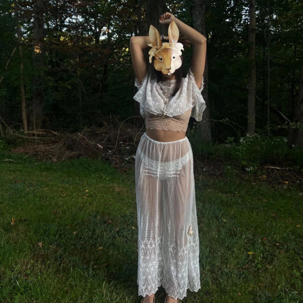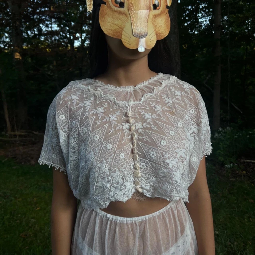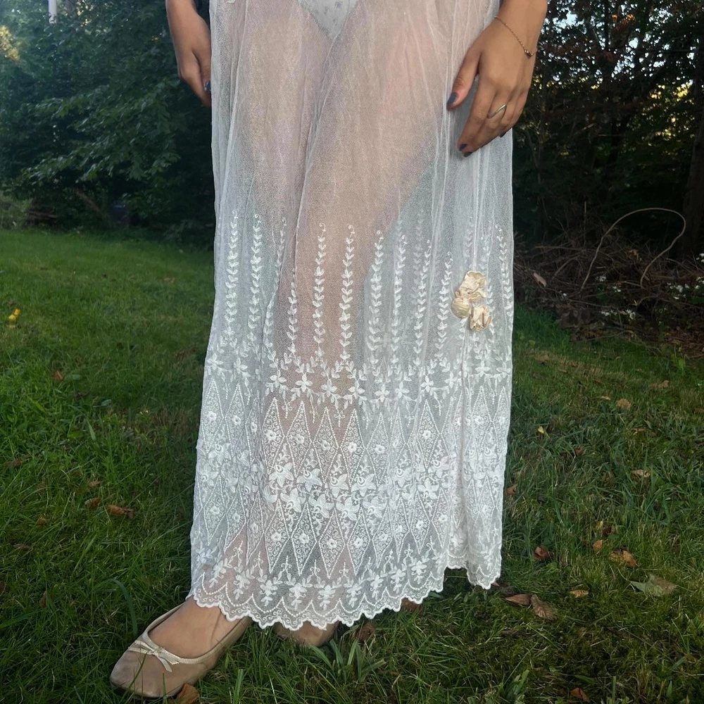 antique sheer embroidered net lace ensemble 🦢✨ intricate embroidery throughout . light , chic , feminine . wear the top either way lovely to pair with a matching lingerie set underneath ... or nothing ... silk ribbon details on both top & skirt excellent vintage condition. Recommended size: free size (added elastic waist) - best for XS-M please read vintage condition guide prior to purchasing. check out my website for more! model measurements: waist: 26.5” hips: 36” bust: 32” height: 5’2 #wedding #gown #antique #1920s #antiquedress femme feminine edwardian ballet balletcore prom ballgown magical whimsical fantasy coquette cottage wedding dress bridal vintage historic museum layered tiered fairy victorian 20s 30s 40s lace lacey 1900s 1910s set