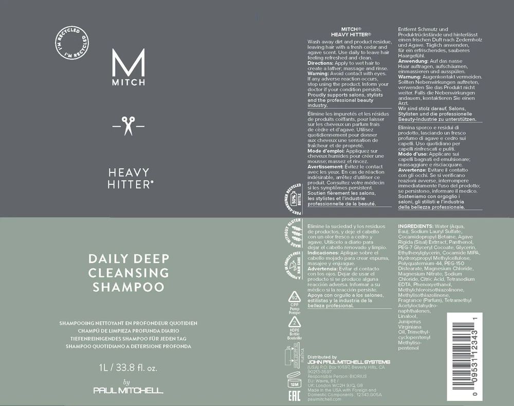 Product Description Try ® Heavy Hitter® for a powerful clean feeling. Specially formulated for men, this daily deep cleansing shampoo washes away dirt and product buildup without stripping the scalp of its natural oils. It invigorates the senses and leaves hair smelling great. Hair Type: Ideal for All Hair Types. Fragrance: Infused with the energizing scent of citrus and agave. Brand Story is premier men’s hair care from John Paul Mitchell Systems—the leader of salon-quality products committed to the professional beauty industry. Every purchase supports JPMS salons with a commission. Washes away dirt and product buildup for a powerful clean feeling Won’t strip the scalp of natural oils Invigorates the senses with an energizing citrus and agave scent