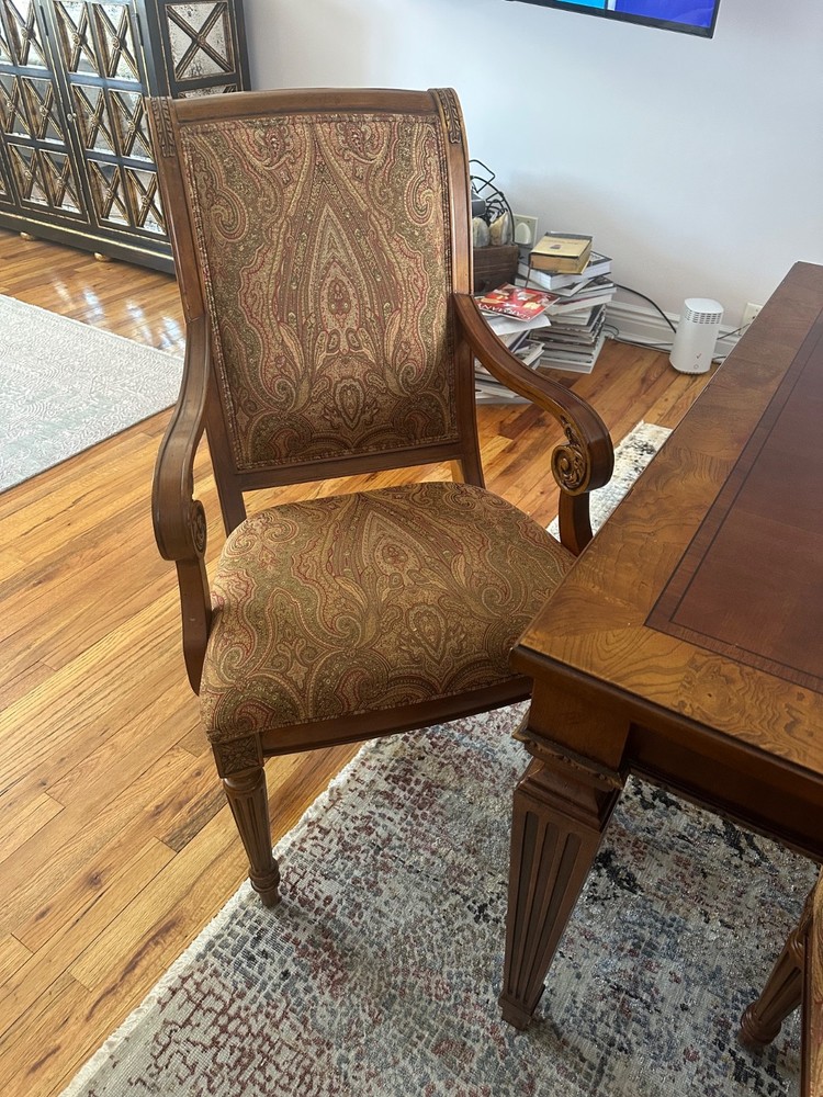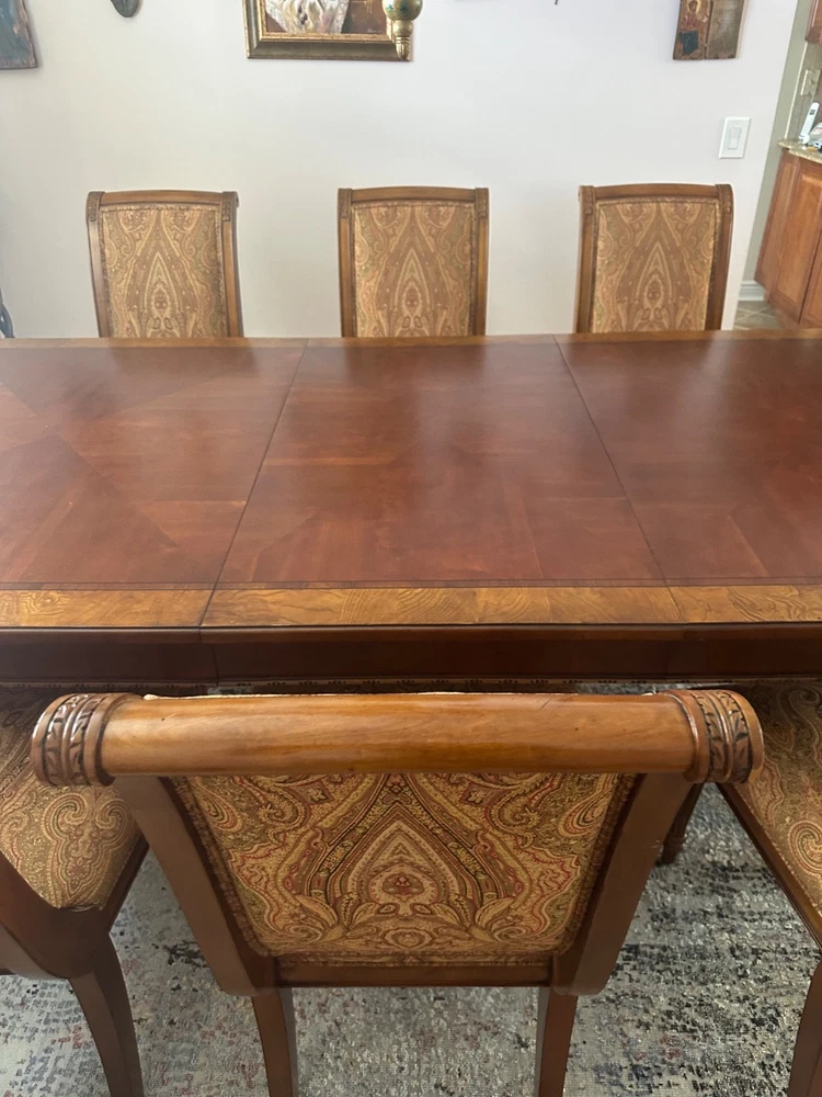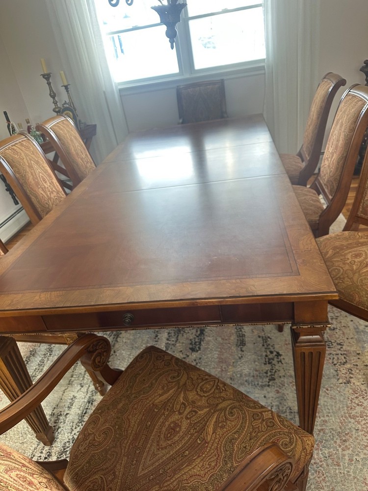 Set Includes:Dining TableNumber of Items in Set:9Handle Material:WoodAdditional Parts Required:NoItem Height:30 inAssembly Required:NoBrand:Ethan AllenEra:21st Century (2000-Now)Material:WoodColor:BrownRoom:Dining RoomMounting:FreestandingNumber of Shelves:8Seating Capacity:8Department:Adults