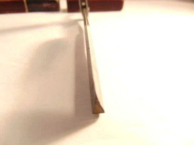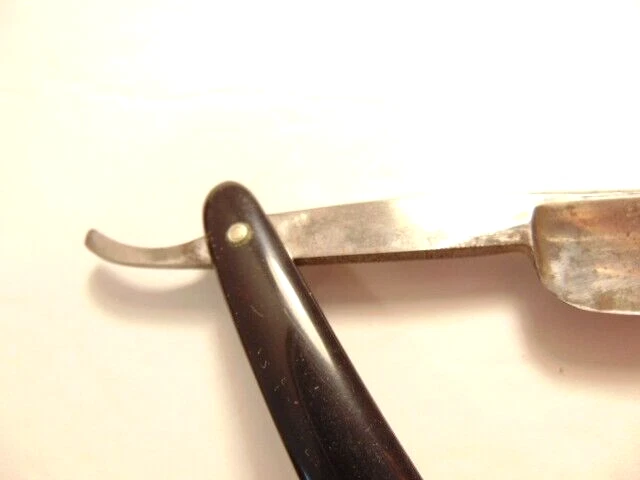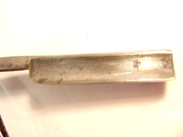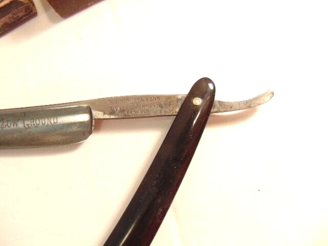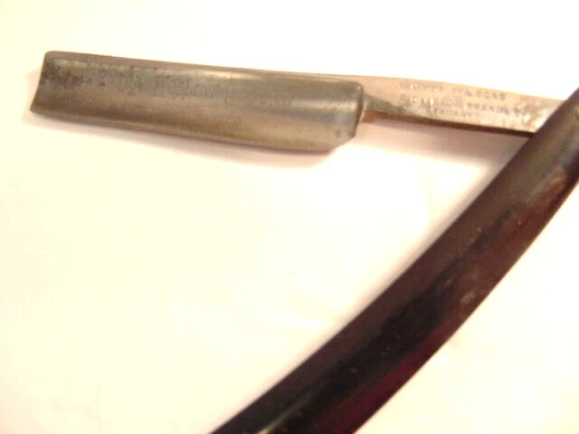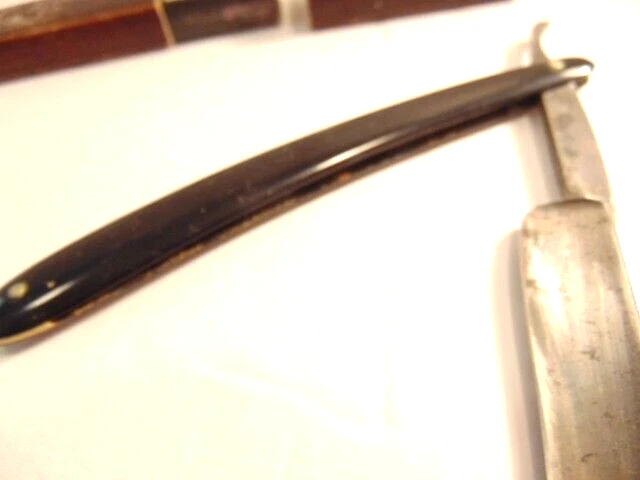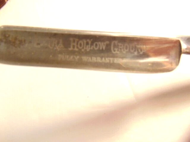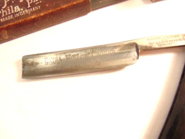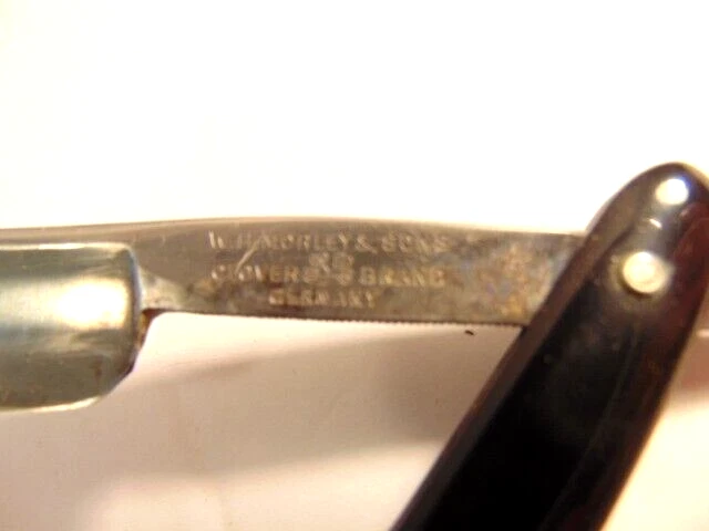 Here is an older extra Hollow Ground straight razor (etched on the face of the blade) and marker W.H. Morely & Sons, Clover Brand, Germany. The razor measures about 6 1/2 inches long. The blade itself measures 5 1/2 inches from tip to tip and is 5/8th inches wide. The razor shows signs of normal use with some wear, dirt scratches, and staining. There is some light wear on the handle, but no breaks or chips noted The box shows some wear and is not original to the razor. Please see the pictures and ask any questions. Thank you for looking. (Inv 23,421)