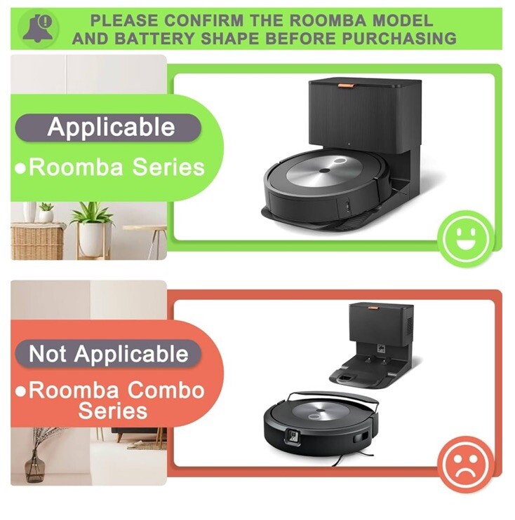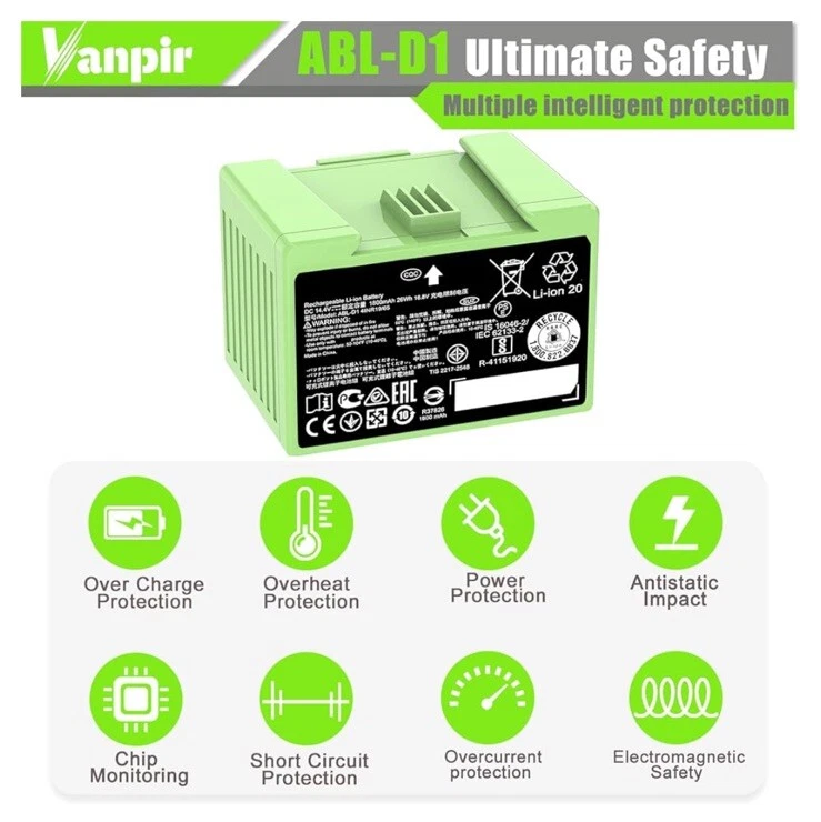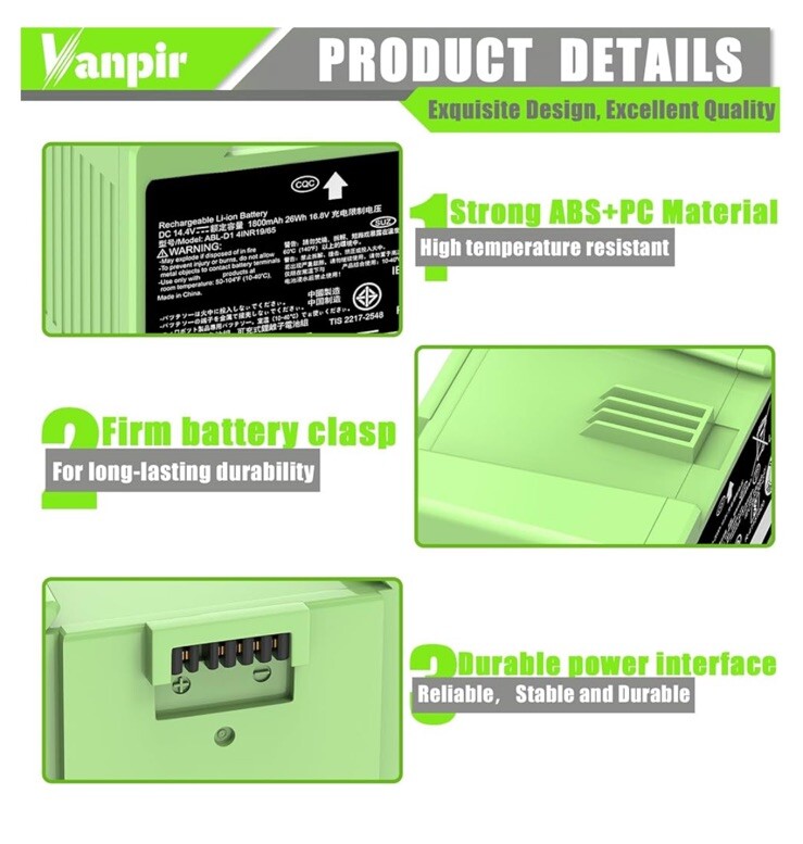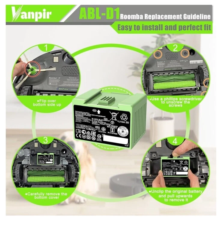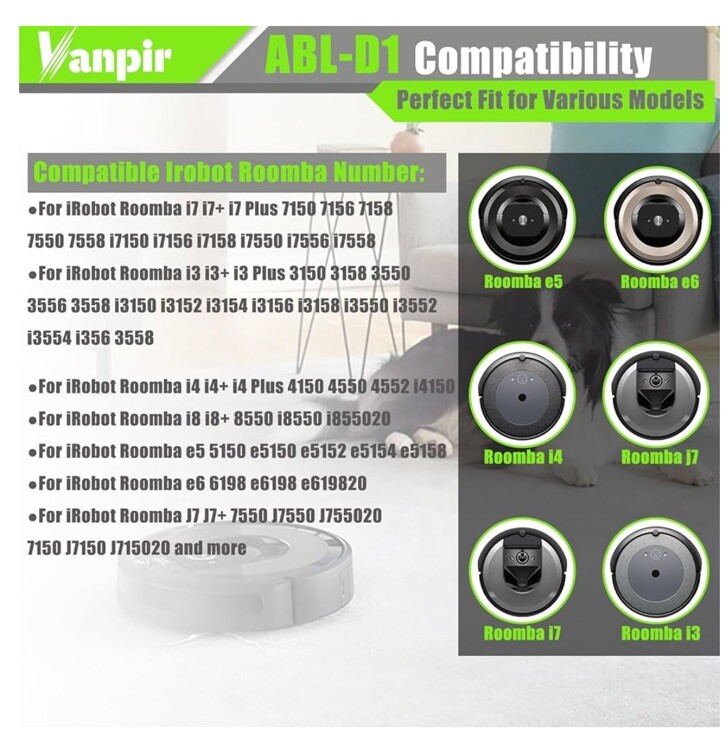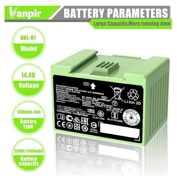 ✅【Compatible Roomba Models】 Fit for iRobot Roomba i and e Series, fit for i7 i7+ i7 Plus J7 J7+ J7 Plus 7150 7156 7158 7550 7558 i7150 i7156 i7158 i7550 i755020 i7556 i7558, i3 3150 i3+ i3 Plus 3150 3158 3550 3556 3558 i3150 i3152 i3154 i3156 i3158 i3550 i3552 i3554 i356 i3558, i4 4150 i4+ i4 Plus 4550 4552 i4150, i6 i8 8550 i8+ i8 Plus i8550, e5 5150 e5150 e515020 e5152 e5154 e5158 e515840, e6 e 6198 e6198 e619820, ABL-D1 4INR19/65 ABL-D2 4INR19/66 (Not Compatible with Roomba Combo Series) 🔋【Specifications】 Battery Model: ABL-D1. Battery type: Li-ion. Voltage:14.4V. Capacity:1800mAh/26Wh. 100% Compatible with iRobot Roomba i & e Series. Replacement Parts for iRobot Roomba i7 i7+ j7 j7+ i3 i4 i8 e5 e6 ✅【Note】 Before purchasing, please verify your roomba model. Follow the instructions step by step during installation. Store the battery in a cool place. If your Roomba uses a third-party charging dock, make sure the roomba does not run out of charge during use. The battery should have at least 10% remaining charge, otherwise excessive discharge of the battery can damage it and prevent it from charging. 👍【Safe to Use】 Battery is made of premium rechargeable battery cells and the adaptive chip is added to stabilize the output current and voltage, no memory effect, which will not affect the Roomba in any way. The battery can perform up to 1000 cycles of use. ABL-D1 Battery for iRobot Roomba i7 i7+ j7 j7+ 7150 7158 7556 7558 i3 i3+ i4 i4+ i8 i8+ and e5 e6 5150 6198 Replacement Battery for Roomba i and e Series (not for iRobot Roomba Combo Series) for iRobot Roomba e e5 e6 e5150 e5152 e6198 and i i3 3150 i3+ 3550 i4 4150 i4+ 4552 i6 I7 i7158 i7+ 7150 7550 i8 Plus Replacement Lithium Ion Battery ABL-D1 4624864 4INR19/65 DC 14.4V 1800MAH/26WH