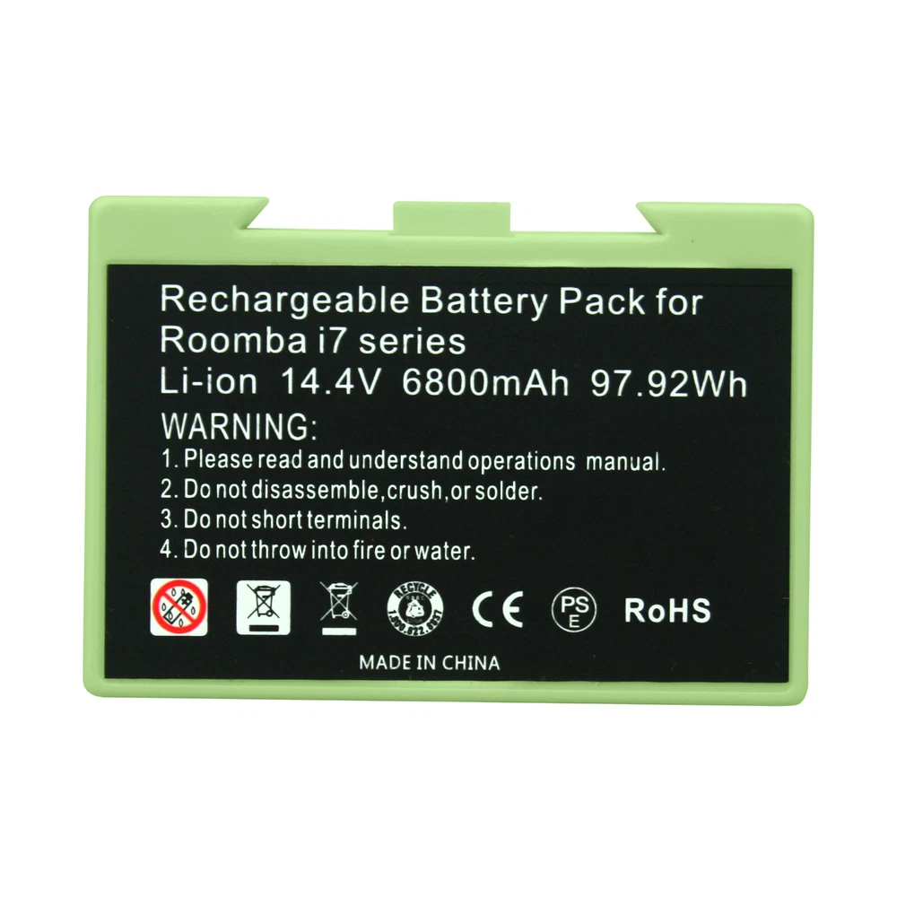 Keep your iRobot Roomba working longer than ever before - with a Banshee battery! This Banshee battery was made to the exact size and voltage to fit in whatever Roomba model you have in your home. 2 YEAR WARRANTY! This battery can replace the following iRobot part numbers: See an easy to read table of iRobot Roomba models this battery fits below ! iRobot Roomba Replacement Battery 2 FREE REPLACEMENT WARRANTY FITS = *Not for Roomba J7* REPLACES iRobot Part Numbers = Battery Specs = Cell Type = Li-ion Capacity = 6800mAh / 97.92Wh Voltage = 14.4v Color = Black Dimensions = 5.48 in x 2.02 in x 1.99 in ( 139.16 x 51.38 x 50.50mm ) Weight = 272.0g