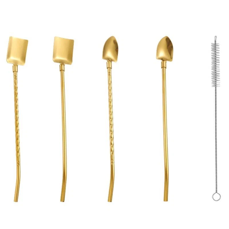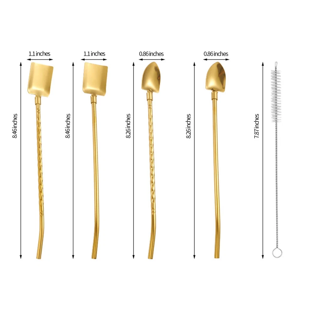 【Material】Our long-handled spoon is made of 304 stainless steel structure, will not rust and corrosion over time, the surface is not rough, healthy, will not cut your hands and mouth, health is perfect for watermelon spoon 、dessert spoon, etc.. 【Multifunctional set】 A set of 4 spoons including smooth flat straw spoon, smooth pointed straw spoon, threaded flat straw spoon, threaded pointed straw spoon, plus a small brush for cleaning straws, this set of spoons is perfect, from stirring cocktails to scooping ice cream, etc., can also be used as a straw, dishwasher safe and healthy, easy to clean 【Fashionable design】 High quality mirror smooth edges are comfortable to use, high quality, 4 spoon sizes are, length: 8.46, 8.46, 8.26, 8.26 inches, width: 1.1, 1.1, 0.86, 0.86 inches, weight: 0.45, 0.42, 0.35, 0.35 ounces, available in two colors, silver and gold, long handle, light weight, good balance, can Teaspoons that can be used for years and easily mixed with existing tableware 【Wide range of uses】 iced tea spoon can be used as ice cream spoon, stirring spoon, cocktail spoon, tea spoon, peanut butter spoon, iced tea spoon, coffee spoon, straw spoon, enough for family, bar, ceremony and party use in many occasions 【Perfect Choice】 Our spoons are a practical gift that can be used as a gift, they are the ideal kitchen utensils for any home or restaurant, if there is anything that you are not satisfied with, please feel free to contact us, 24 hours for you to solve.