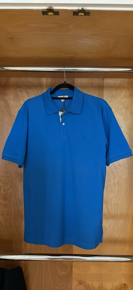 Stay stylish and sophisticated with this men's Burberry Polo Shirt in size Small. Crafted with quality materials, this classic blue polo features the iconic Burberry logo for a touch of luxury. Perfect for casual outings or dressed-up occasions, this regular fit polo is a versatile addition to any wardrobe. Elevate your look with this timeless piece from Burberry. Add a touch of British elegance to your ensemble with this Burberry Polo Shirt for men. Designed in a size Small, this blue polo exudes class and refinement. Whether you're pairing it with jeans for a laid-back look or dressing it up with chinos, this Burberry shirt is a must-have for any fashion-conscious individual. Upgrade your wardrobe with this designer piece that combines style and comfort effortlessly.
