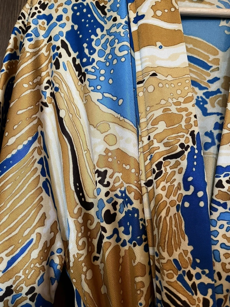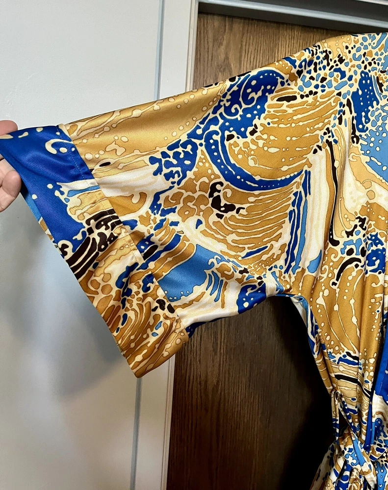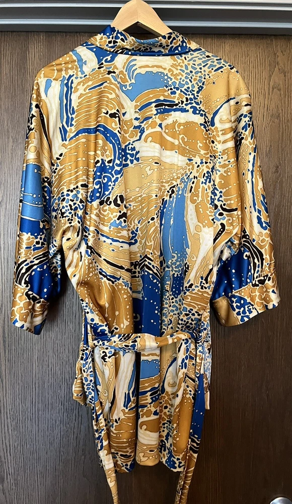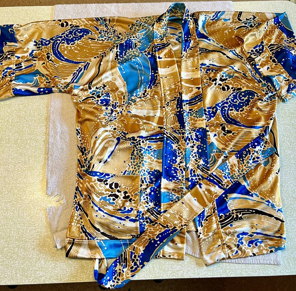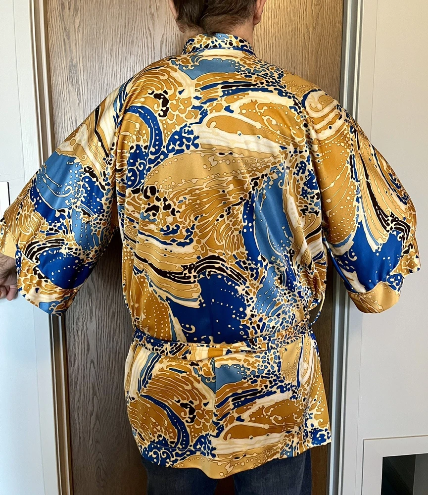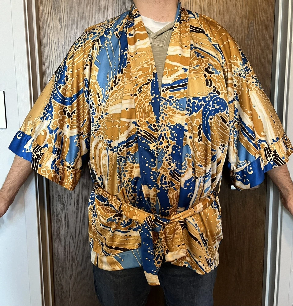 Elevate your loungewear game with this vintage men's Japanese kimono robe. Made of 100% nylon, this robe features a graphic print pattern with a mix of bold and muted colors that make it perfect for any bachelor pad or playboy-inspired wardrobe. The 3/4 sleeves and belted closure add a touch of comfort and style, while the machine washable garment care makes it easy to maintain. Ideal for relaxing at home or as a statement piece for a night out, this robe is perfect for any man who wants to add a touch of Japanese aesthetic to their wardrobe. The robe's theme is inspired by Japanese culture, making it a unique and trendy choice for any fashion-forward man. So why wait? Take your loungewear to the next level with this vintage men's Japanese kimono robe. The item will be very carefully packaged and shipped promptly upon receipt of payment. All items I sell are guaranteed to be as described and pictured, or your payment will be refunded upon return of the item in its original condition.