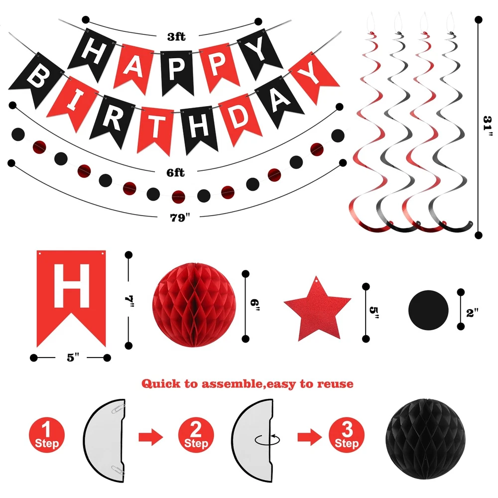 meowtastic Birthday Decorations, Happy Birthday Banner with Honeycomb Balls, Star Hanging Swirl Streamers, Circle Dots Garland, Happy Birthday Party Decorations for Women Men Boys Girls (Red & Black) Vibrant Color: Bring a burst of color to your birthday party with our Birthday Decorations, featuring a wide range of bright and bold colors, our party decorations will create a lively and festive atmosphere that your kids and their friends will love. Package Including: With our Birthday Party Decorations package, you'll have everything you need to create the perfect party atmosphere. You can get 1pcs Happy Birthday Banner, 6pcs Honeycomb Balls, 8pcs Stars Swirls Streamers, and 1pcs Circle Dots Decorations. No need to worry about running around and finding individual items. It's convenient package. Easy to Assemble: Say goodbye to complicated and frustrating decoration set up. Save time and money with our easy-to-assemble Happy Birthday Decorations. You can get your party venue ready in no time, and with minimal effort, you can create a stunning party space that will leave a lasting impression on your child and their guests. Versatile and Reusable: Our Birthday Decor are made with only the best materials, ensuring they look great and last a long time. You won't have to worry about flimsy decorations falling apart during the party! Plus, they're reusable, so you can use them again and again for future celebrations. You won't have to worry about buying new decorations every time you throw a party! Perfect for Any ages: Are you looking to add a touch of whimsy to your kids or friends birthday party? Our Birthday Decorations Set is the perfect way to do just that! With a range of colorful and fun decorations, you can create a magical atmosphere that your kids for friends will remember for years to come. Warning: This product is design by our company, registered with U.S. copyright and design patents (Reg. No.: VA0002405781). Unauthorized use or sale is prohibited, infringement will be pursued. Vibrant Color: Bring a burst of color to your birthday party with our Birthday Decorations, featuring a wide range of bright and bold colors, our party decorations will create a lively and festive atmosphere that your kids and their friends will love. Package Including: With our Birthday Party Decorations package, you'll have everything you need to create the perfect party atmosphere. You can get 1pcs Happy Birthday Banner, 6pcs Honeycomb Balls, 8pcs Stars Swirls Streamers, and 1pcs Circle Dots Decorations. No need to worry about running around and finding individual items. It's convenient package. Easy to Assemble: Say goodbye to complicated and frustrating decoration set up. Save time and money with our easy-to-assemble Happy Birthday Decorations. You can get your party venue ready in no time, and with minimal effort, you can create a stunning party space that will leave a lasting impression on your child and their guests. Versatile and Reusable: Our Birthday Decor are made with only the best materials, ensuring they look great and last a long time. You won't have to worry about flimsy decorations falling apart during the party! Plus, they're reusable, so you can use them again and again for future celebrations. You won't have to worry about buying new decorations every time you throw a party! Perfect for Any ages: Are you looking to add a touch of whimsy to your kids or friends birthday party? Our Birthday Decorations Set is the perfect way to do just that! With a range of colorful and fun decorations, you can create a magical atmosphere that your kids for friends will remember for years to come. Warning: This product is design by our company, registered with U.S. copyright and design patents (Reg. No.: VA0002405781). Unauthorized use or sale is prohibited, infringement will be pursued. Shipping from the USA All of our products are shipped from the USA, ensuring quick delivery to your destination. Payment We offer the following payment methods: PayPal, credit card, bank transfer, and eBay's secure payment system. Free Shipping & Free Returns Shipping within the USA is FREE. Additionally, any return is absolutely free for you. Risk-Free Purchase You have the option to return an item within 30 days without any justification. We cover the return shipping costs! Fast Shipping We ship immediately upon receipt of payment. Generally, the package is delivered within 2-3 days in the USA. If it takes longer, we will contact you. Quality and Costs Made in Europe, USA, China No customs fees or additional charges Total satisfaction guarantee Invoice with declared VAT available upon request in .pdf format Feedback Your feedback is very important to us. After you pay for your purchase, you will automatically receive positive feedback from us.