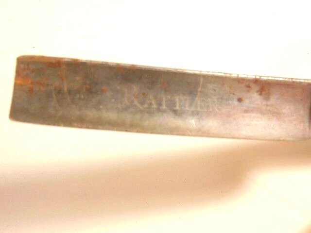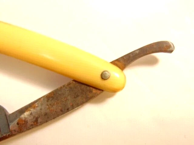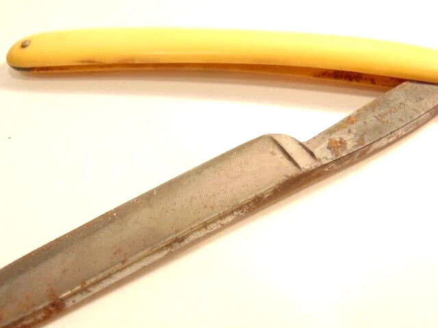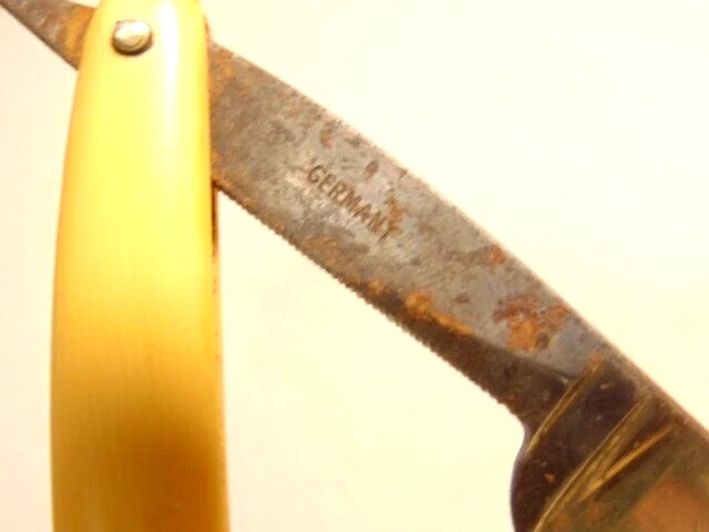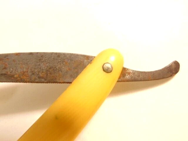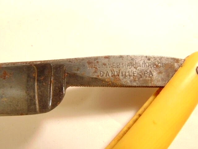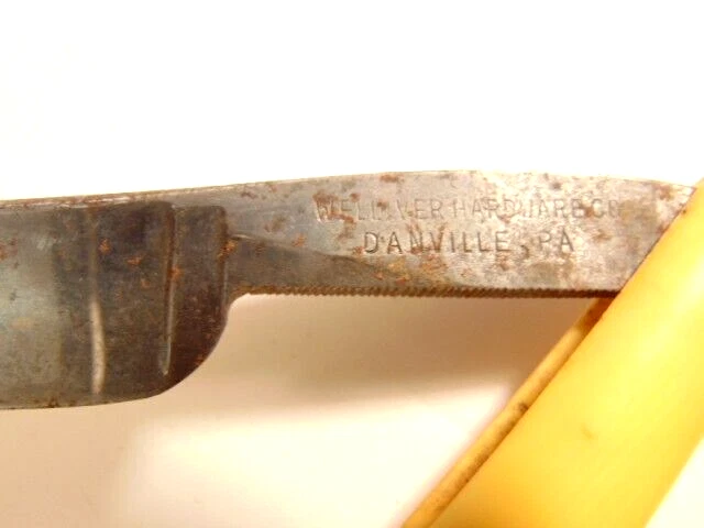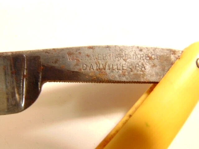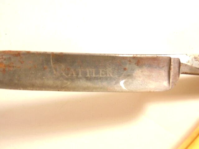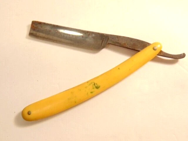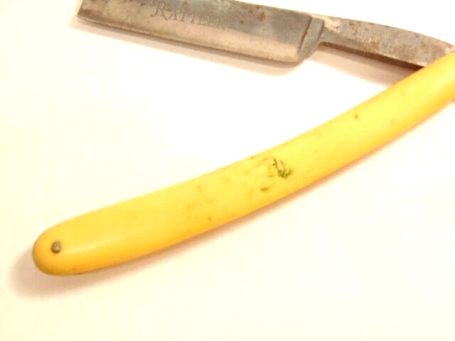 Here is a pre-owned old straight razor marked "Rattler" on the face of the blade and Germany near the rivet. The blade is also labeled "Welliver Hardware Co. Danville, PA". It measures about 6 inches long. The blade measures about 5 1/2 inches long and is about 5/8th inches wide. The razor shows some wear on the blade including staining and light corrosion on the blade and dirt on the yellow handle. Please see the pictures and ask any questions. Thank you for looking. (Inv 23,115)