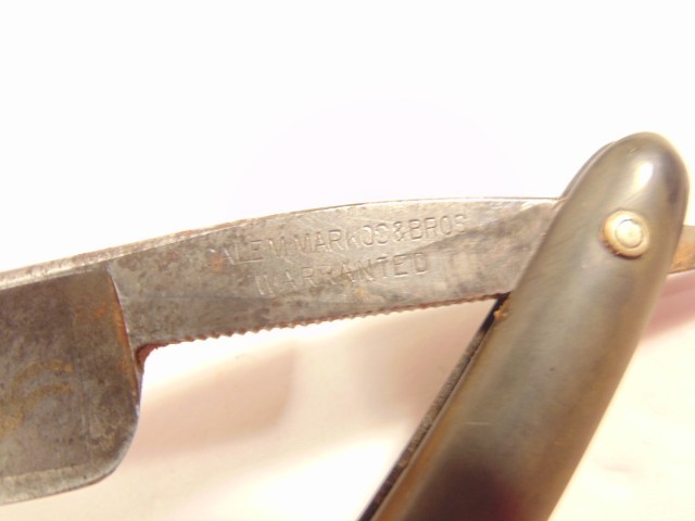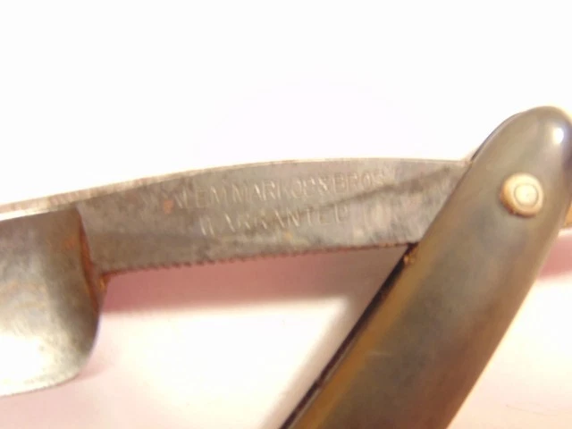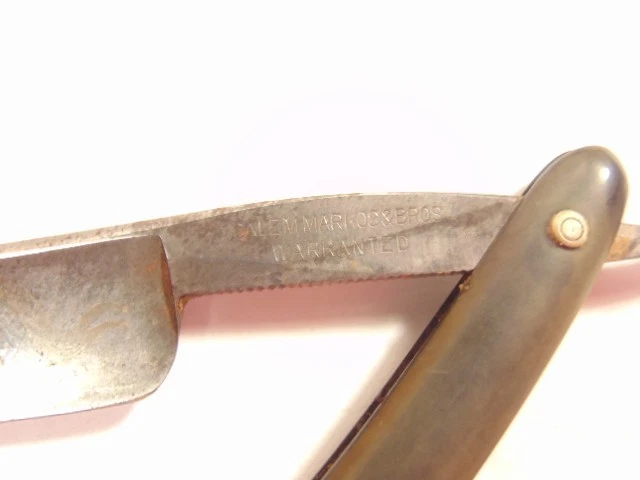 Here is an old straight razor labeled "Salemarkos & Bros. Warranted". The blade is labeled "Magnetic Steel" on the face. The razor measures about 6 inches long and the blade is 5 3/8th niches long from tip to tip. It shows some light tarnish, dirt and wear. Please see pictures and ask any questions. Thank you for looking. (Inv A30,069)