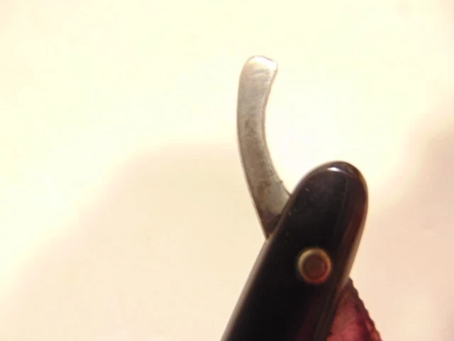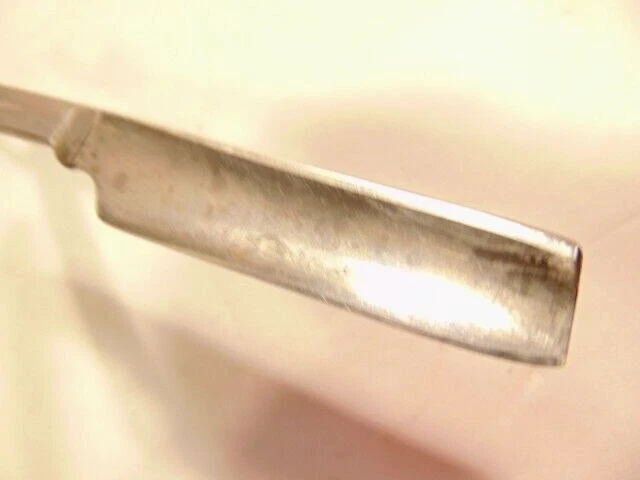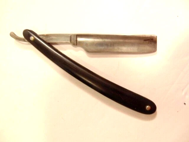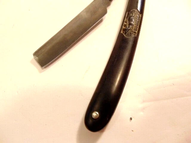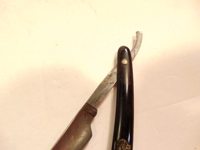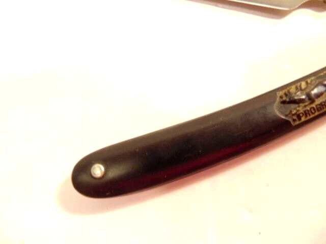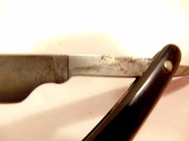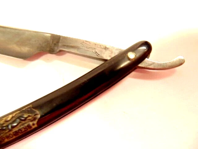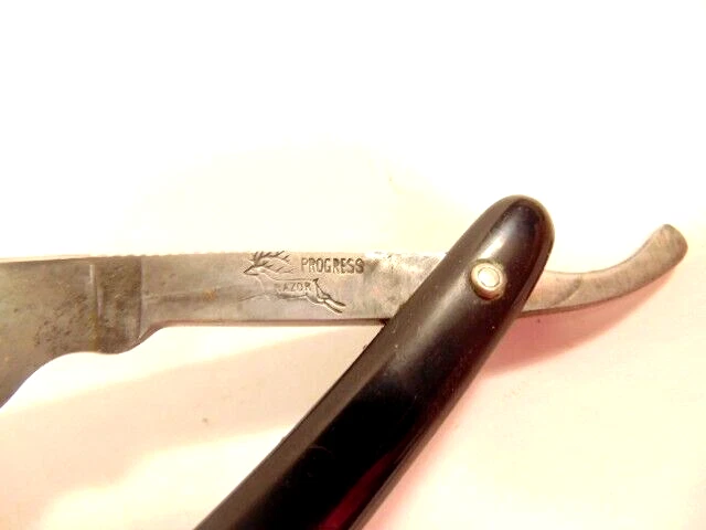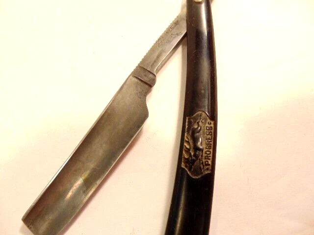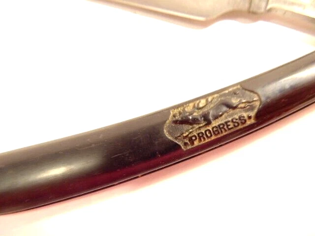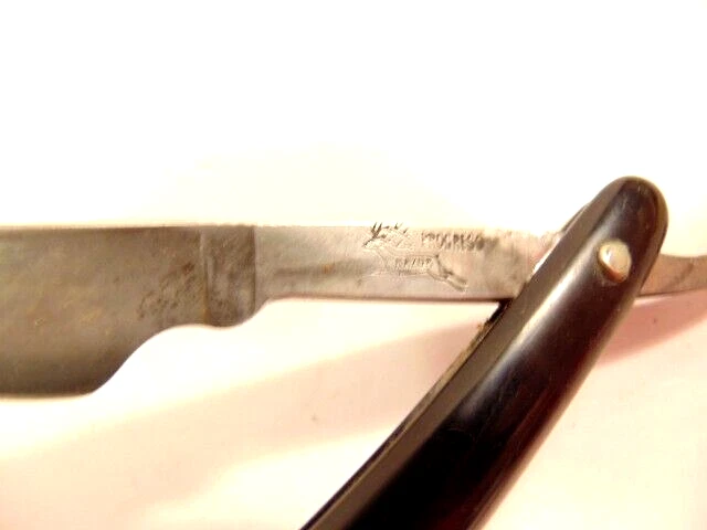 Here is an older, pre-owned straight razor marked "Progress" & logo on both the handle and blade. The razor measures about 6 inches long. The blade measures about 5 1/4 inches long and is about 5/8th inches wide. It shows staining, dirt and wear. Please see the pictures and ask any questions. Thank you for looking. (Inv 22,971)
