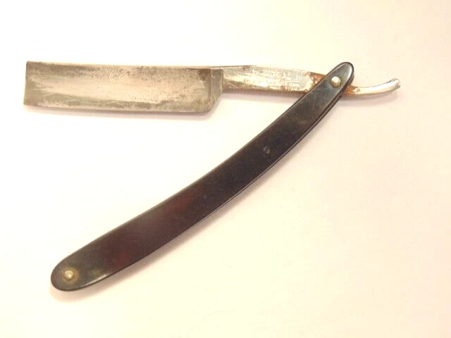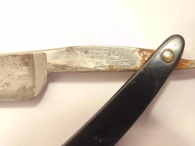 Here is a pre-owned older used Geneva Cutlery Co. straight razor. This is a usable razor but has been used and shows tarnish, dirt, wear including some scratches. The blade does not center well and needs guided into the groove. Please see the pictures and ask any questions. Thank you for looking. (Inv A27,245)