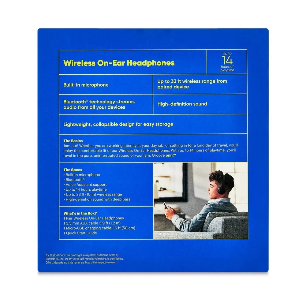 onn. Wireless Bluetooth on-Ear Headphones, Black (New) Up to 24 hours of playtime Bluetooth wireless technology streams audio from all your devices High definition sound with deep bass Lightweight, collapsible design for easy storage Built-in microphone Up to 33 ft (10 m) wireless range Voice Assistant support