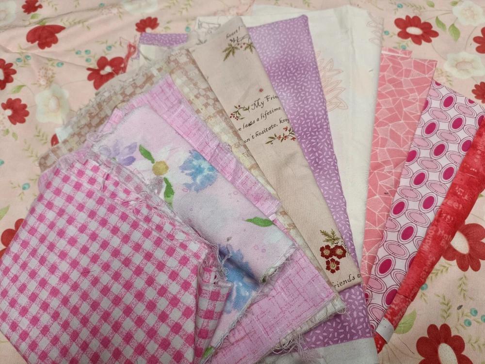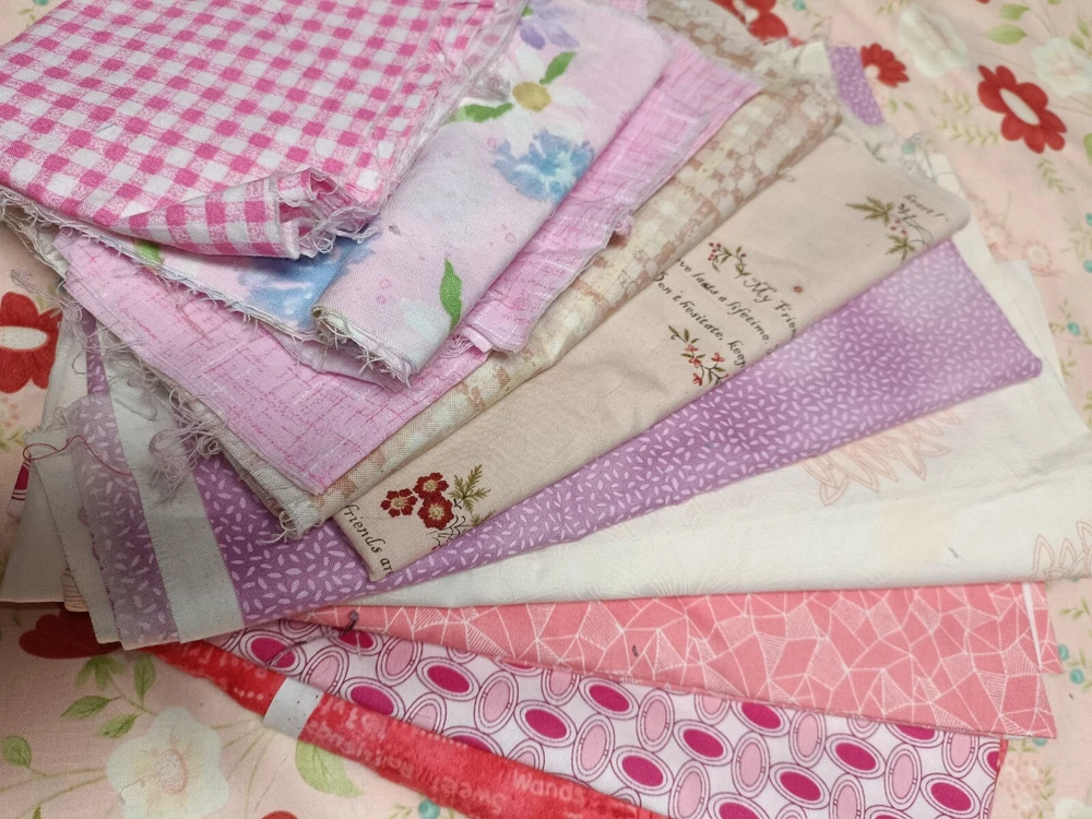 Pretty pink/purple/red cotton scrap fabric lot perfect for quilting or other textile crafts. High quality versatile fabrics. Includes fabrics with florals, plaids, abstract imagery, picturesque cartoons, etc. some are cut in square, others may be strips or rectangles.