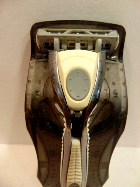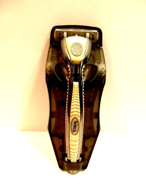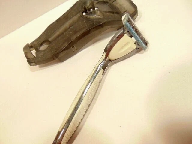 Here is a pre-owned gray Schick safety razor in plastic cradle. It does not show a specific model name or similar information. It currently has a razor blade head - but is assumed used and should be replaced. Please see pictures and ask any questions. Thank you for looking. (Inv A28,804)