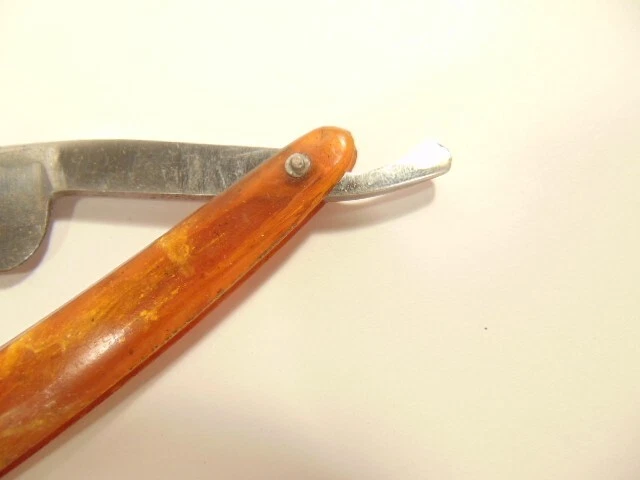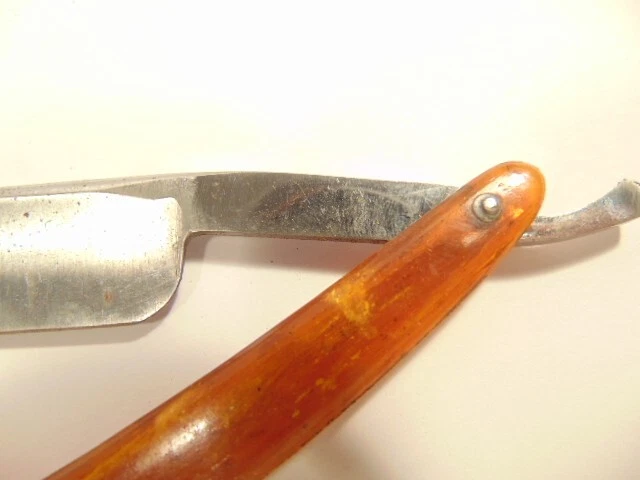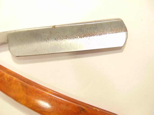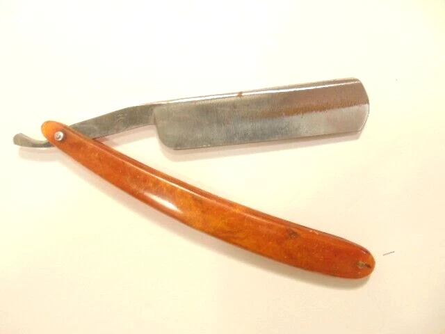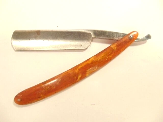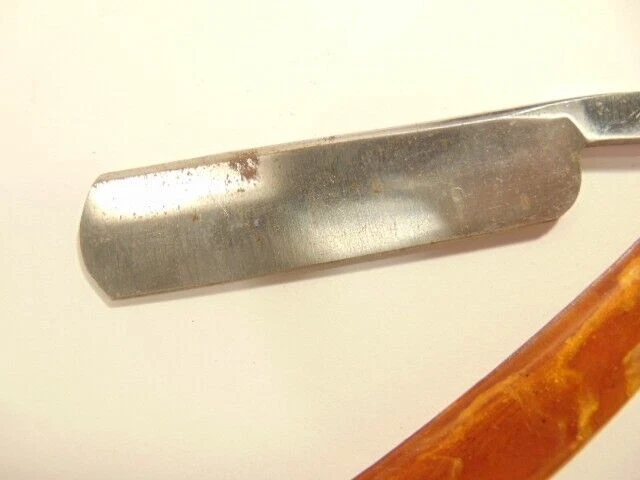 Here is a pre-owned straight razor with a brown plastic handle marked "Pakistan". There is no labeling on the metal blade or stem. The blade shows some dirt and some corrosion. The razor measures a total of 5 7/8th inches in length. Please see the pictures. Thank you for looking. (Inv 28,082)