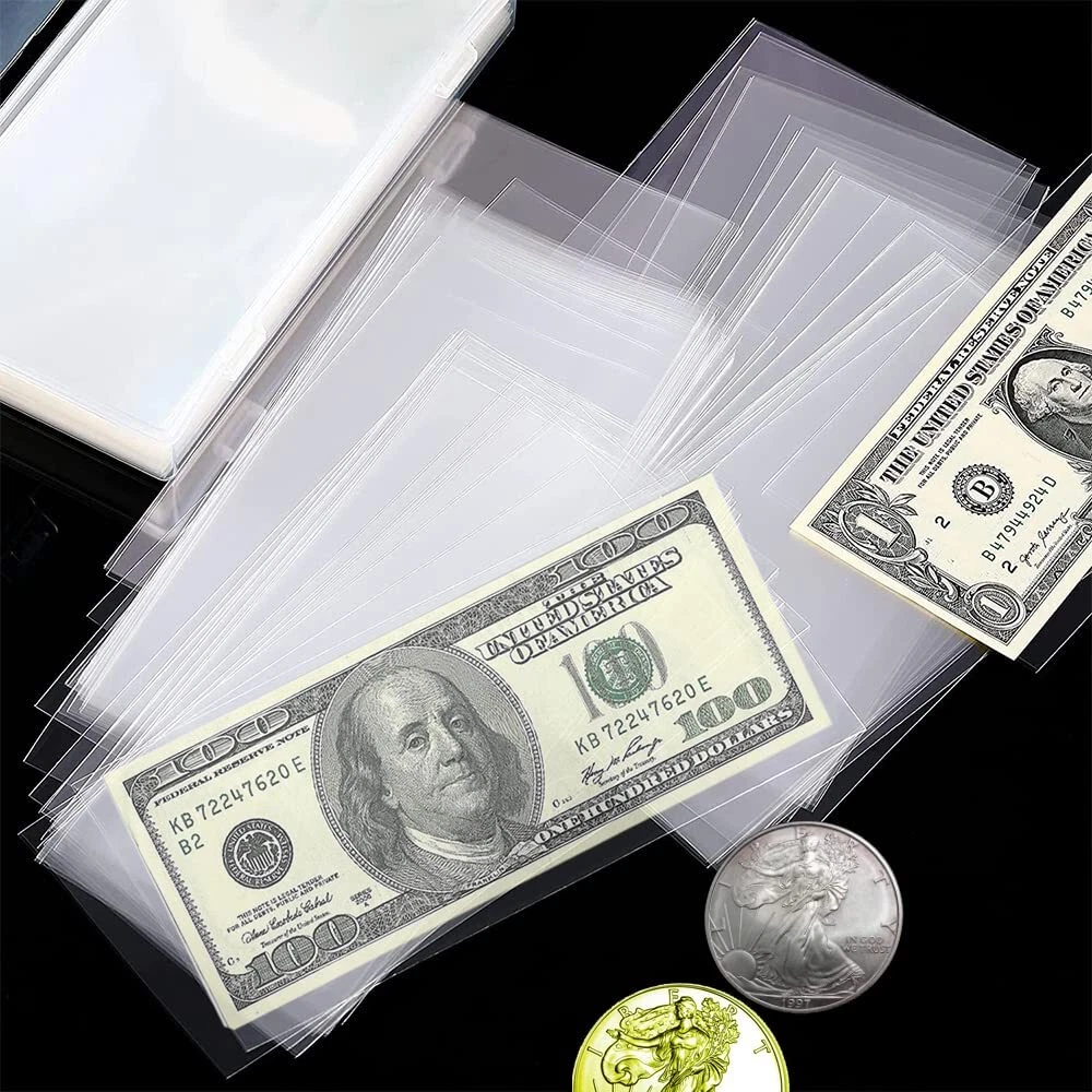 Product Description : 100 Pieces Clear Paper Money Sleeves with Storage Box, plastic dollar holders , Currency Album Organizer ,Dollar Bill Holder Box for Currency, Money, Bill, Banknote, Stamp etc.Imagine receiving this box for your birthday or graduation filled with money .... it will certainly make an amazing and joyful impression! Features: - Made of PP material, crystal clear, thick and durable - Prevent your collection from water, dust and breakage - Transparent design allows you to appreciate your collection - A good way to display your collection - Great for organizing currency, banknotes, souvenirs, stamps, etc - Perfect gifts for friends who have the same collection hobby as you Specification: Material: PP Color: Transparent Size of transparent bag: 17x8.5cm/ 6.71x3.32 inch Size of money storage box: 18.4x9.4x4 cm/ 7.27x3.72x1.58 inch Package Includes: 100 x transparent paper money bags 1 x money storage box Note: Manual measurement, please allow slight errors on size. The color may exist slight difference due to different screen display. 【You Will Get】100 pieces of clear paper money sleeves , a translucent storage box, suitable for store paper dollar bills, Slab Holder, Banknote, Stamp 【Mini Portable Dimension】The clear paper money sleeves size is:17.5 x 9cm/6.92 x 3.55inch; the storage box is: 18.4 x 9.4 x 4cm/7.27 x 3.72 x 1.58inch, this size is suitable for many kinds of banknotes and commemorative coins and other collectibles 【Quality material】Our currency sleeves are made of PVC, thicker and transparent, no softener, no harm to banknotes or currency, dust-proof and reliable, suitable for displaying currency and keeping it clean 【Nice Gift】The currency holder is good choice for collector, friends, colleague, family who are loving collecting banknotes 【 Friendly Customer Service 】 If you have any concerns, please feel free to contact us anytime. Our friendly and reliable customer service will respond to you within 24 hours. Your satisfaction is our greatest encouragement
