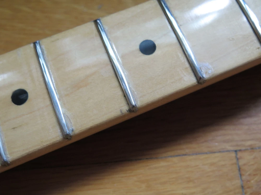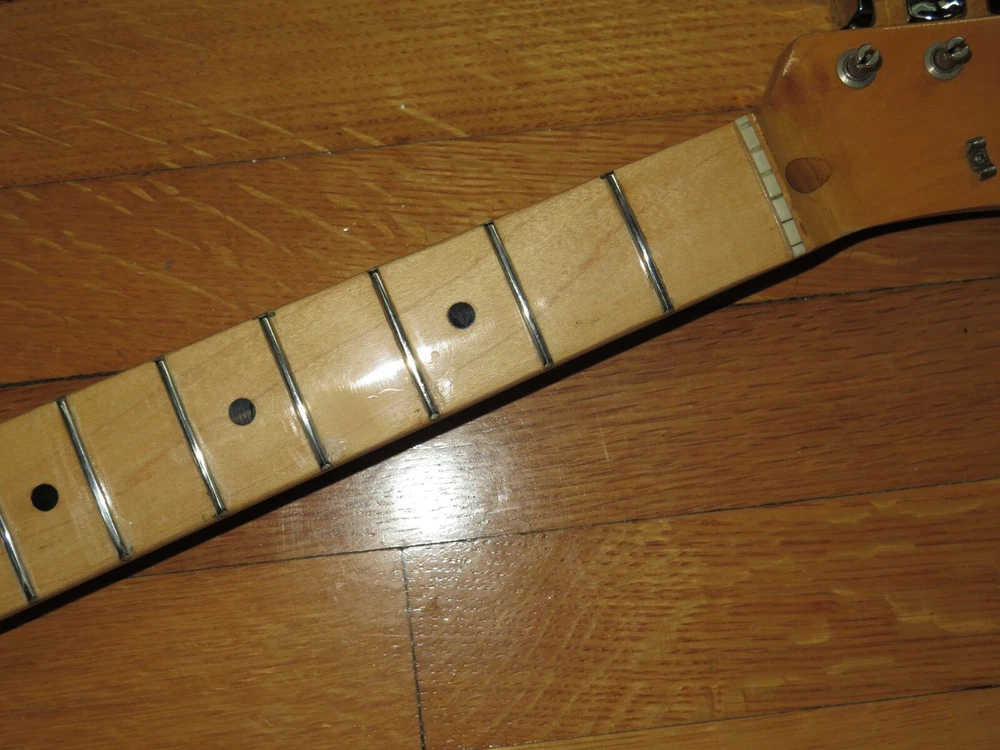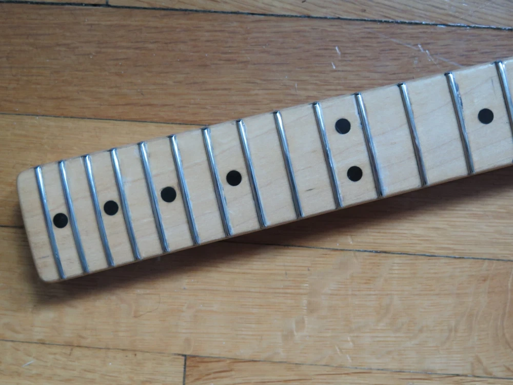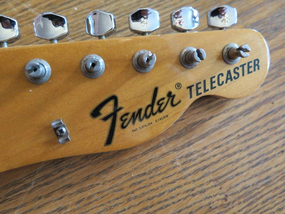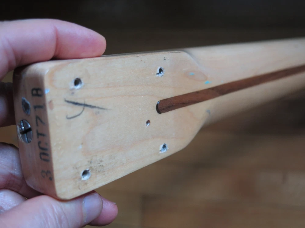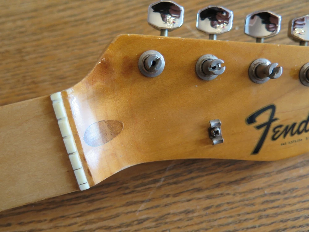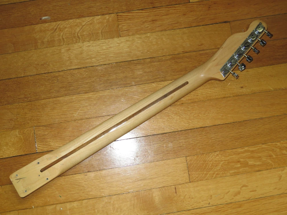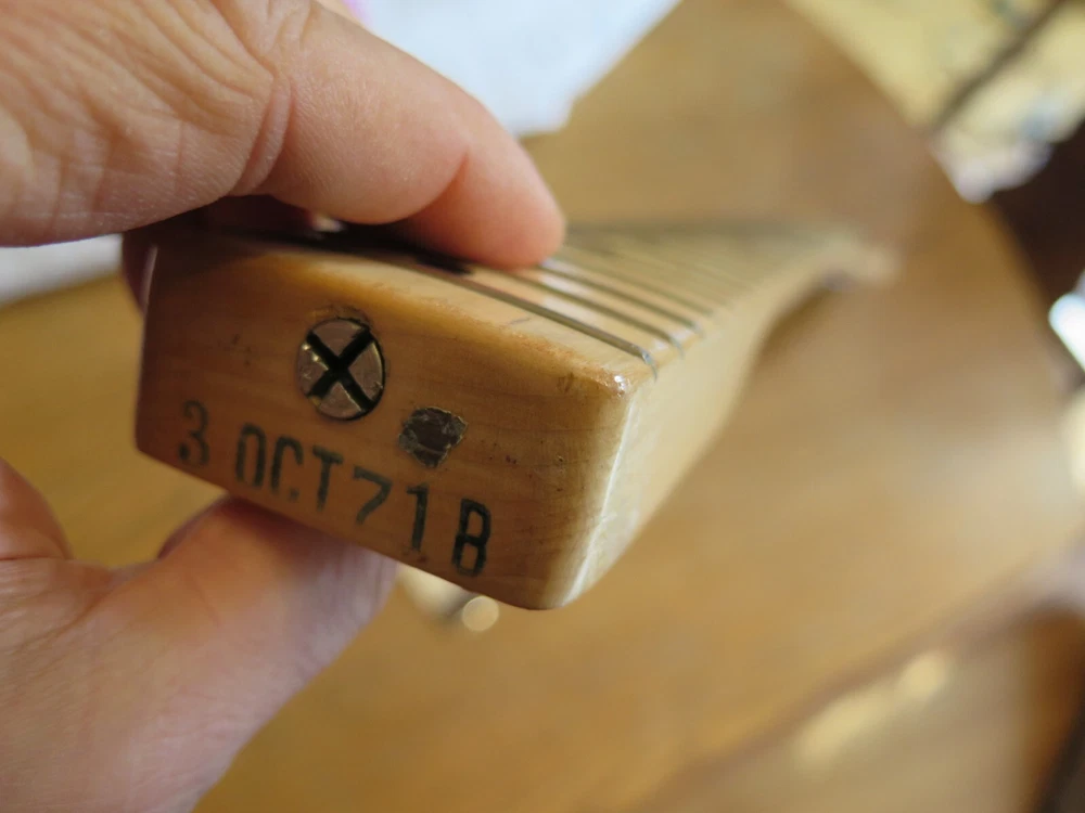 from Retro Guitar Parts vintage guitars + parts. "Archtop and Jazz Specialist" click on "see other items" to check out our many new and vintage USA guitar parts! vintage 1971 fender maple neck + tuners for telecaster This is a 1971 Fender tele neck in really nice clean condition. It has a fresh refret with jumbo frets. It is a nice job....the frets are level and the neck is straight...guaranteed to play really nice! Original tuners in great shape! (Of course with any newly assembled project, you may have to do a light fret level for optimal playing action. ) I am getting a depth of .904 inch at the first fret. .945 at the 12th fret. It is not a baseball bat depth, but also might be described as just a hair thicker than medium profile. I think it feels great and I like a pretty standard medium profile. The original clear lacquer is intact throughout and the neck looks amazing. It is straight and truss rod works. No warp or twist. The original lacquer shows a few minor scars here and there from refret work...pretty normal stuff....could be touched up more but it is fine as is. October 1971 stamp on the end of neck heel. New frets are high/wide type with a radius of 7.25. Similar to dunlop 6105 but wider looking. They feel great. See lots of detail pics of fret work. It's a FAB opportunity to get a cool neck to restore a 1971 Telecaster! shipping to usa 45.00