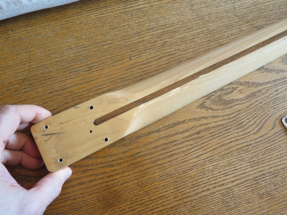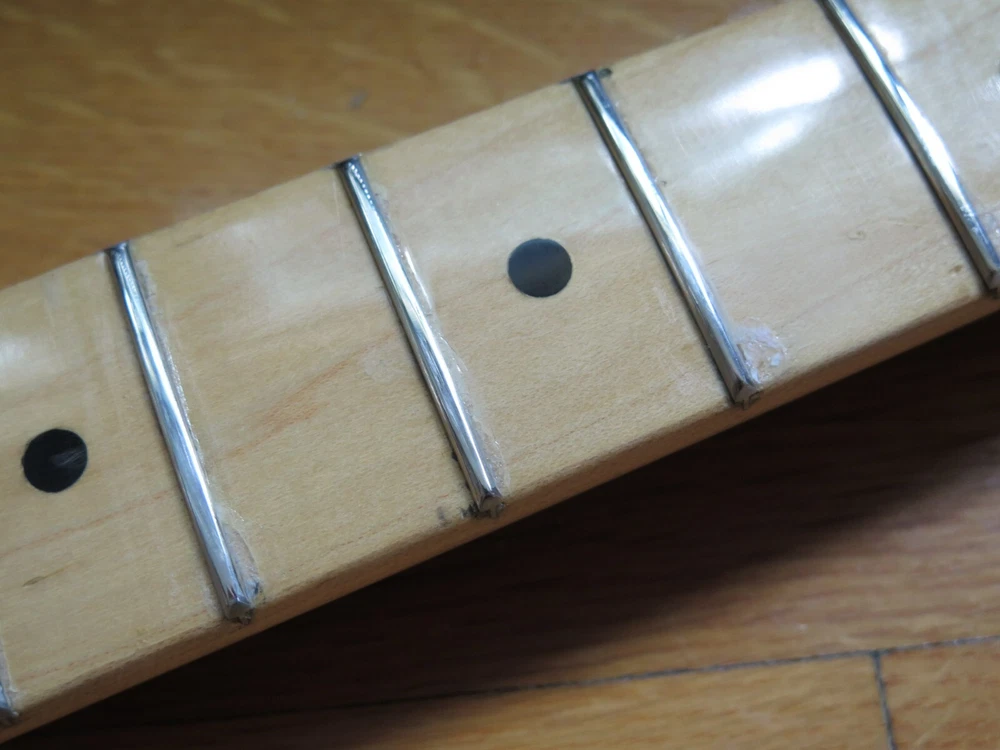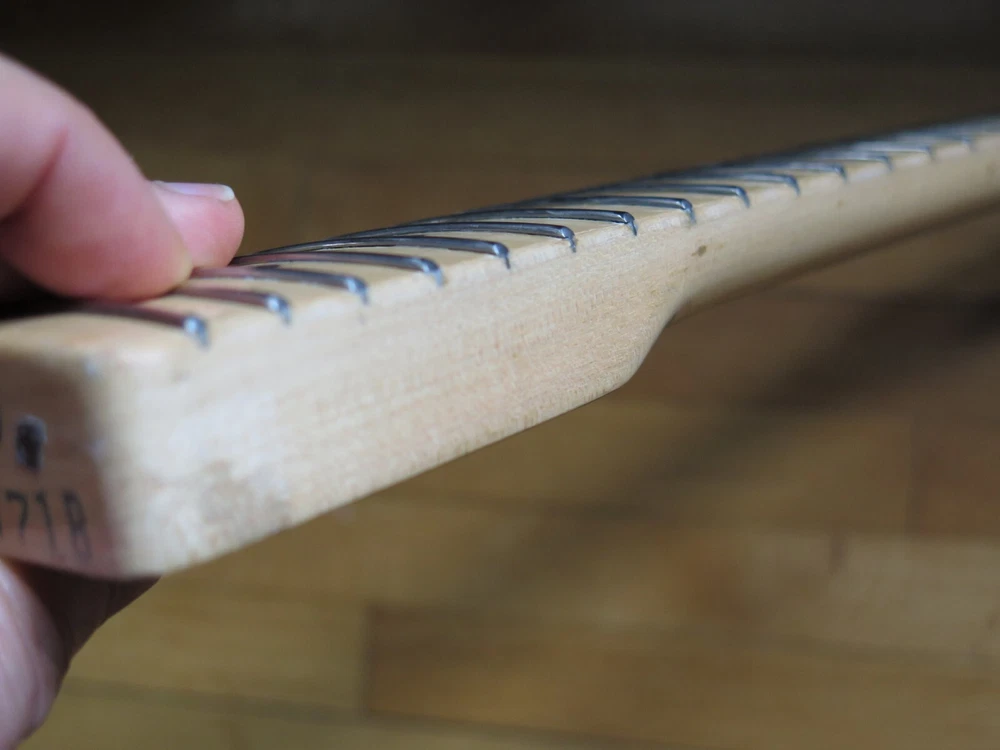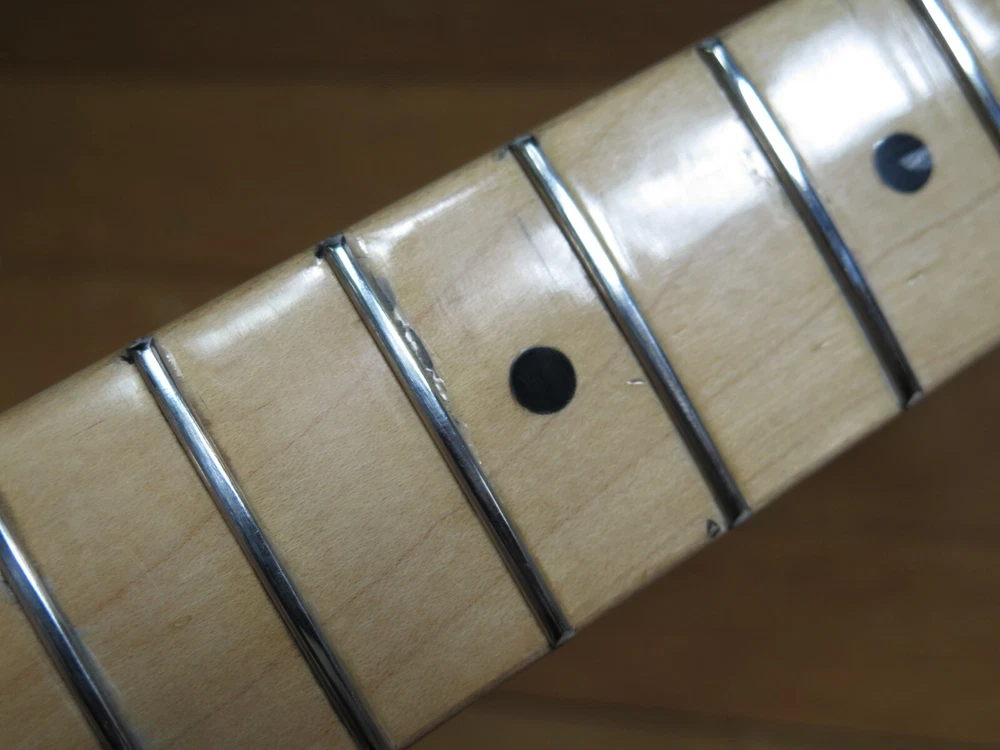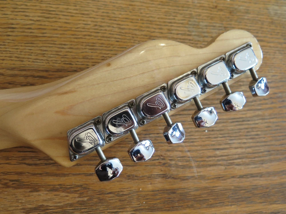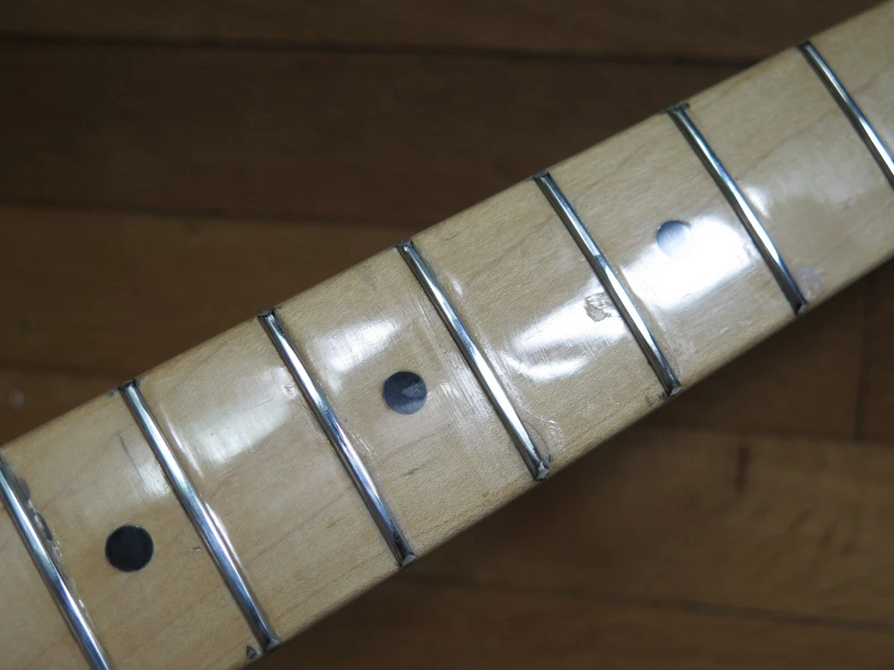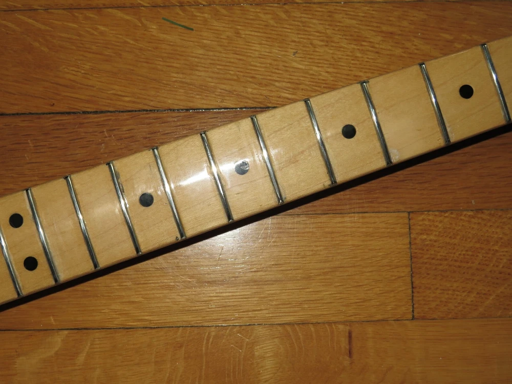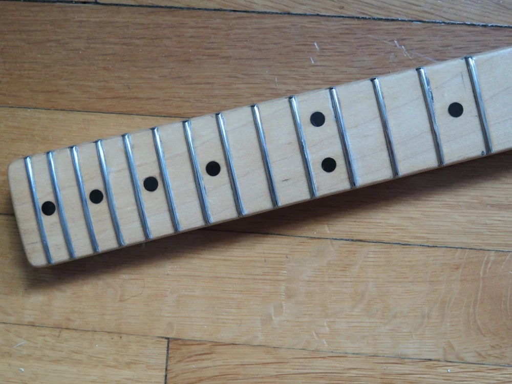 from Retro Guitar Parts vintage guitars + parts. "Archtop and Jazz Specialist" click on "see other items" to check out our many new and vintage USA guitar parts! vintage 1971 fender maple neck + tuners for telecaster This is a 1971 Fender tele neck in really nice clean condition. It has a fresh refret with jumbo frets. It is a nice job....the frets are level and the neck is straight...guaranteed to play really nice! Original tuners in great shape! (Of course with any newly assembled project, you may have to do a light fret level for optimal playing action. ) I am getting a depth of .904 inch at the first fret. .945 at the 12th fret. It is not a baseball bat depth, but also might be described as just a hair thicker than medium profile. I think it feels great and I like a pretty standard medium profile. The original clear lacquer is intact throughout and the neck looks amazing. It is straight and truss rod works. No warp or twist. The original lacquer shows a few minor scars here and there from refret work...pretty normal stuff....could be touched up more but it is fine as is. October 1971 stamp on the end of neck heel. New frets are high/wide type with a radius of 7.25. Similar to dunlop 6105 but wider looking. They feel great. See lots of detail pics of fret work. It's a FAB opportunity to get a cool neck to restore a 1971 Telecaster! shipping to usa 45.00