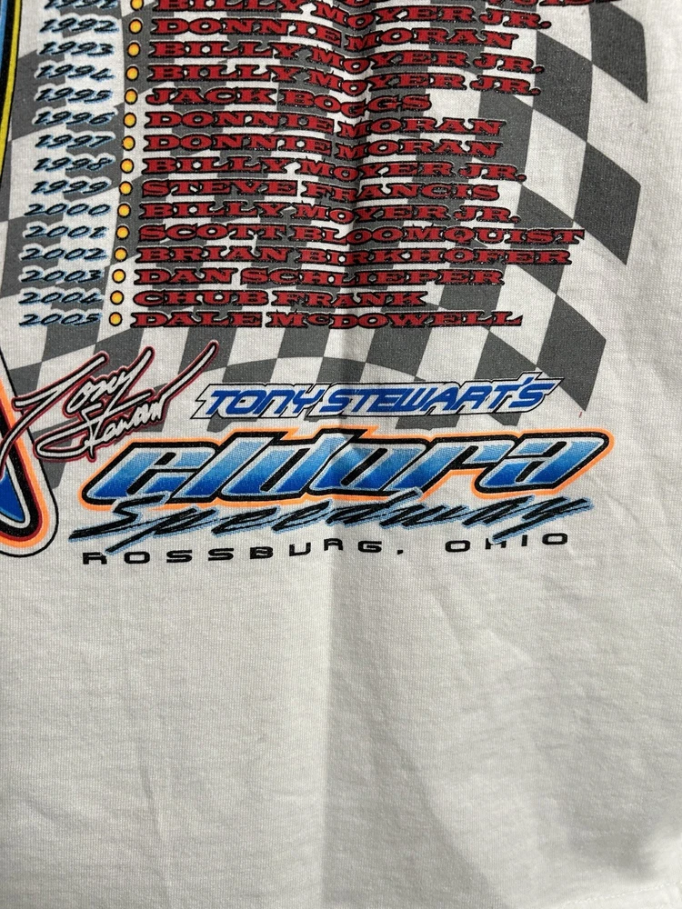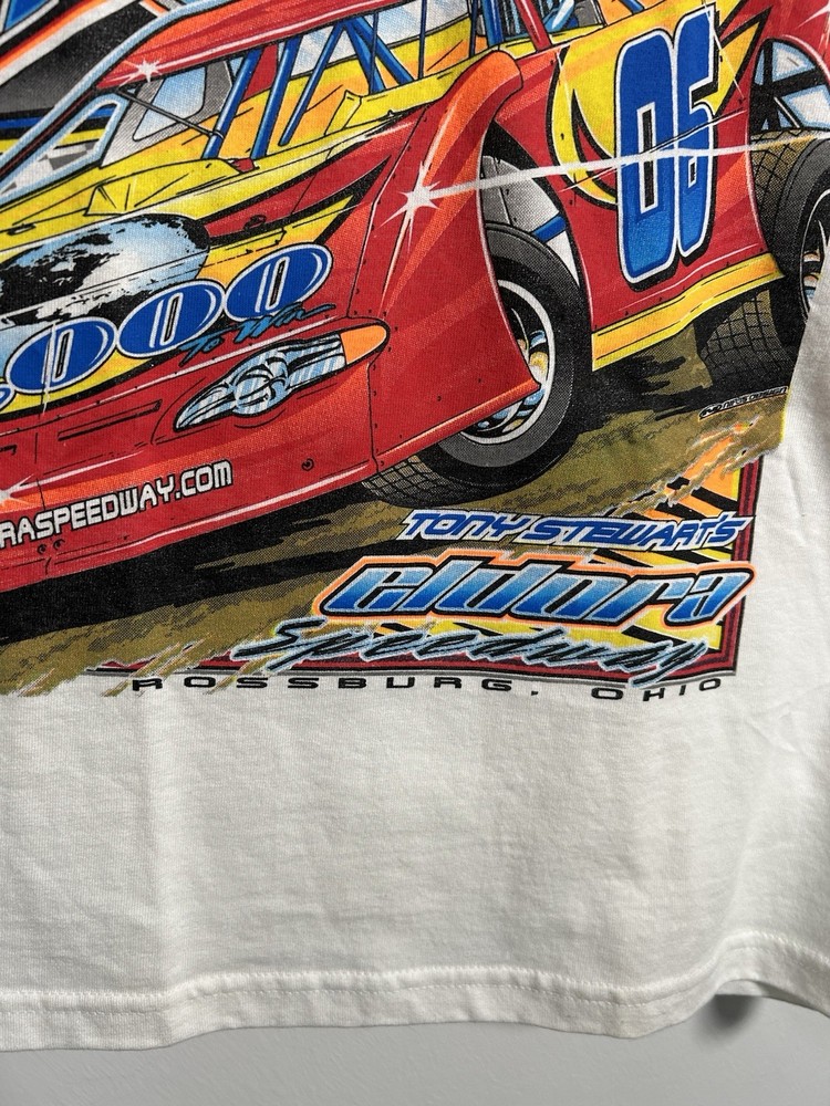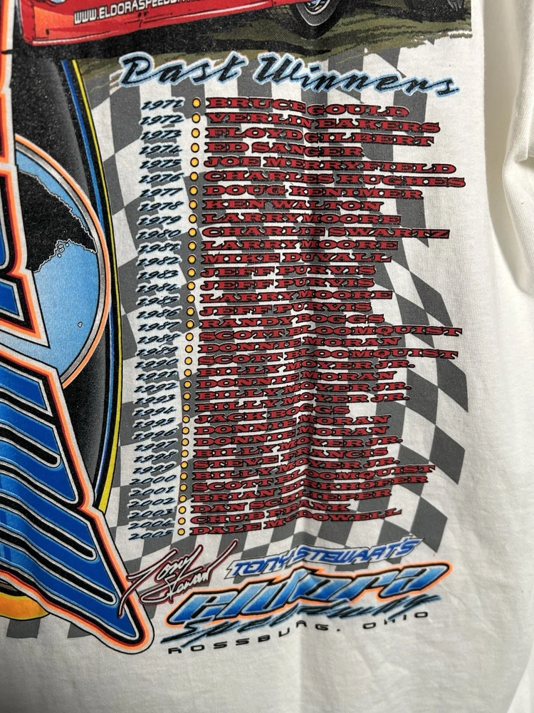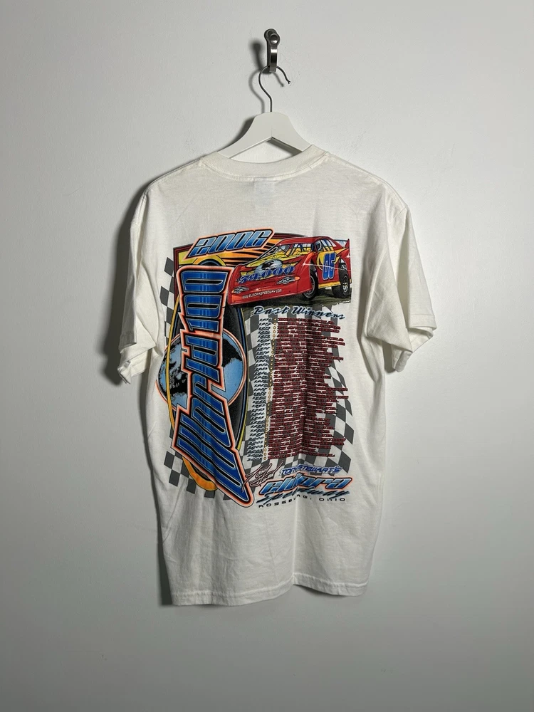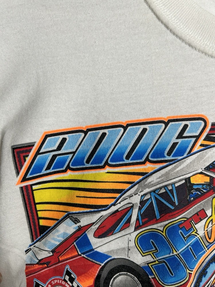 The vintage 36th Annual Eldora Speedway World 100 dirt late model racing t-shirt is a Gildan brand shirt in a white color, featuring a design that captures the excitement of dirt late model racing. This t-shirt is a regular fit for men in size small, making it a perfect addition to any racing enthusiast's wardrobe. Its classic look and comfortable feel make it ideal for showing off your love for the sport both on and off the track.