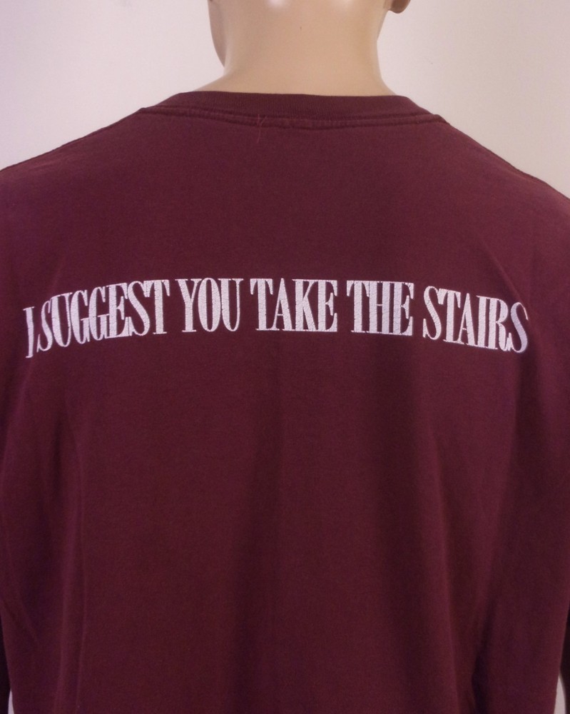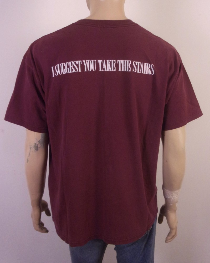 This vintage 90s 00s Y2K Disney The Twilight Zone Tower of Terror T-Shirt in XL size features a maroon color with a graphic print of Mickey Mouse on one side and The Twilight Zone Tower of Terror theme on the other. Made of cotton material with a crew neck and short sleeves, this T-shirt is a regular fit and perfect for fans of the horror genre and classic Disney characters. This unique piece is great for Halloween or adding a nostalgic touch to any outfit. Pit to Pit: 23.5 Length: 27.5