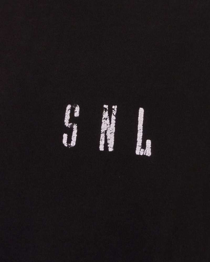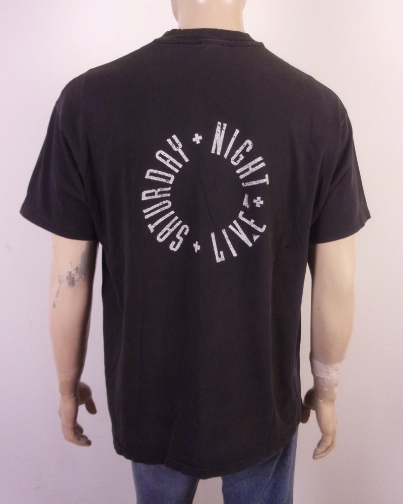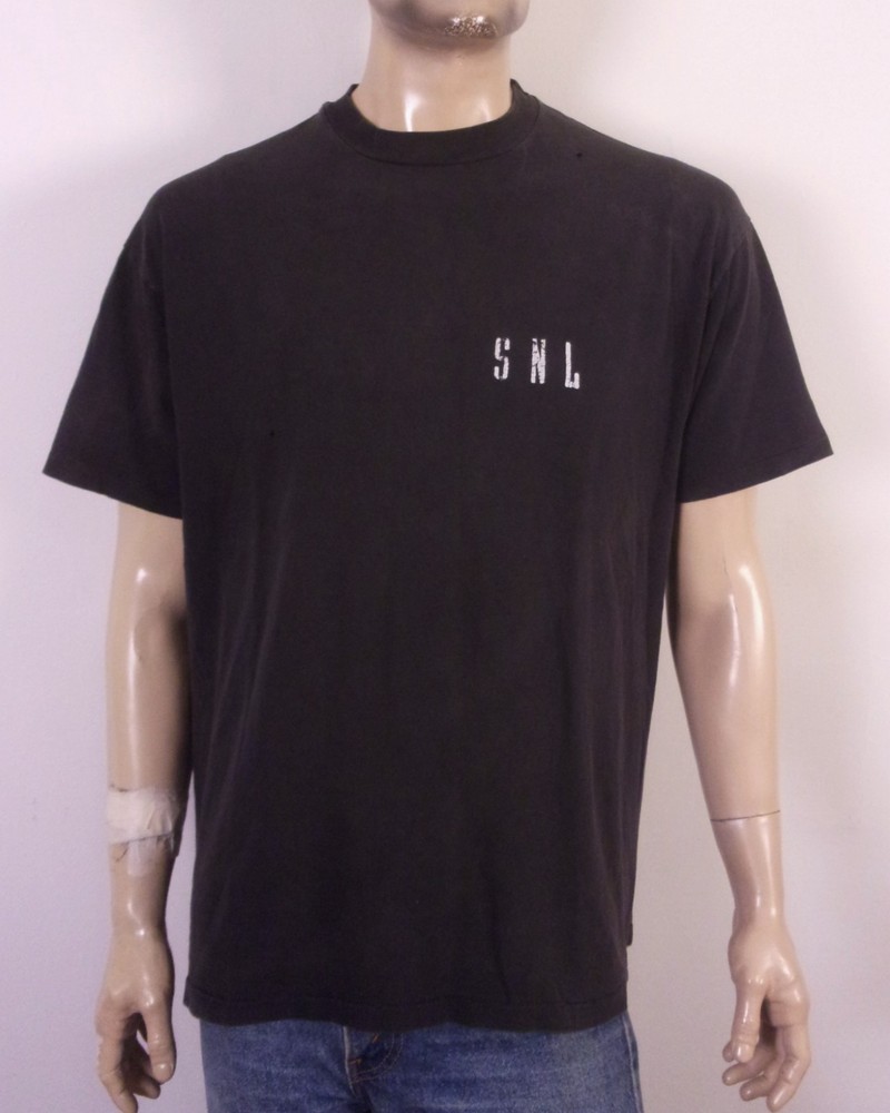 This vintage 90s single stitch SNL Saturday Night Live T-Shirt features a double-sided print with the spell out logo of the popular TV show. Made of soft cotton material, this black shirt in size XL has a crew neck and short sleeves, ideal for all seasons. With a regular fit and a sense of nostalgia for 90s TV comedy, this shirt is a must-have for fans of Saturday Night Live and vintage tees. Perfect for adding a unique touch to any casual wardrobe, this shirt represents a piece of television history. Pit to Pit: 23 Length: 28