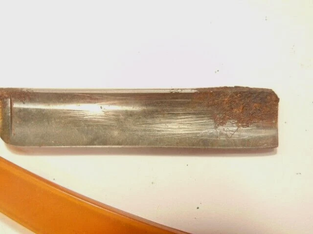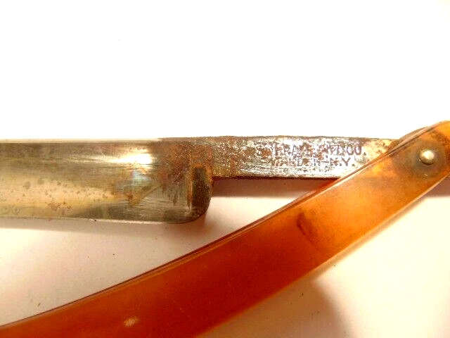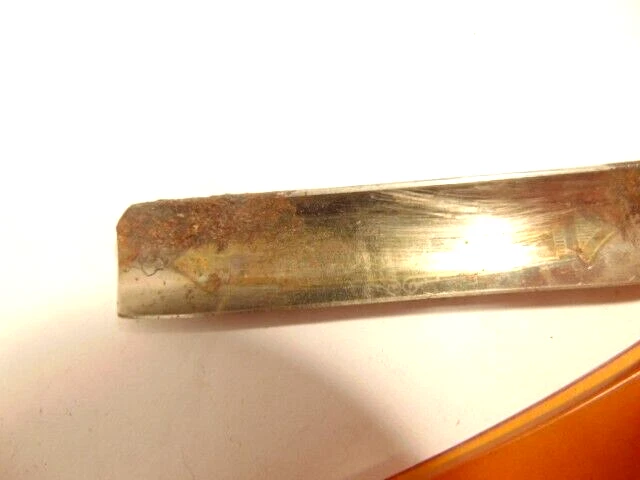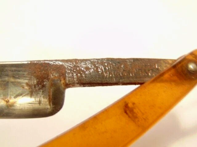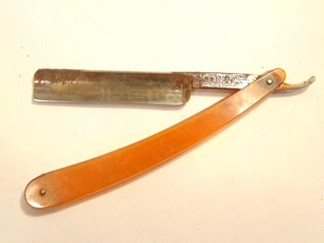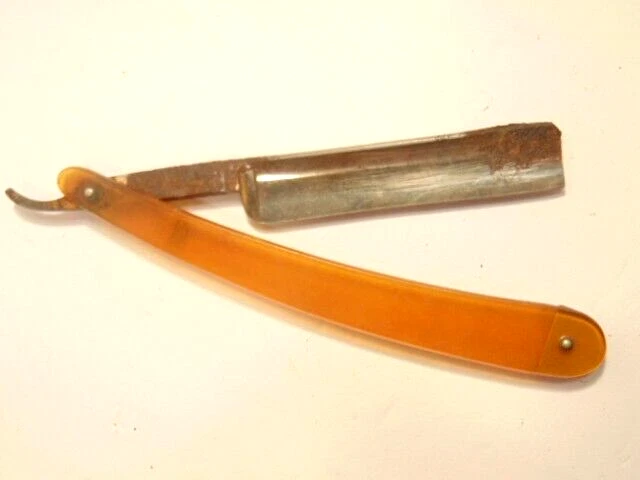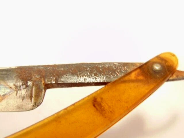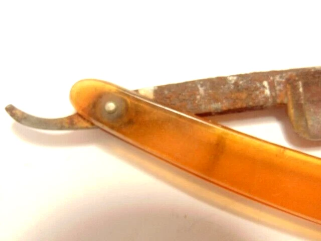 Here is a vintage Schrade Cutlery Co., Walden, NY straight razor with a translucent yellow handle. It measures about 6 inches from end to end when closed. The blade alone measures about 5 1/2 inches from tip to tip and is about 5/8 inches wide. The razor shows some corrosion, dirt, staining and normal wear. The labeling is partly obscured with only some of the Schrade name visible. Please see the pictures and ask any questions. Thank you for looking. (Inv A27,835)