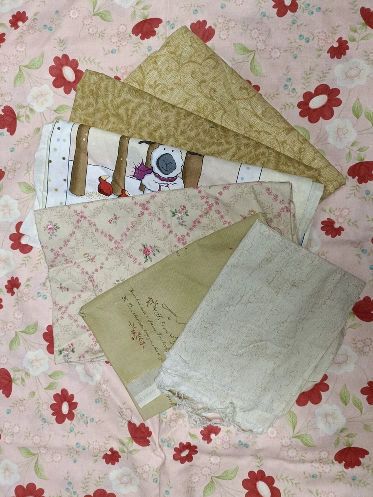 Lovely yellow/beige cotton quilting scrap fabric lot. Fabric is cut in different sizes. Includes florals, vintage motifs, picturesque cartoons, etc. high quality cotton.